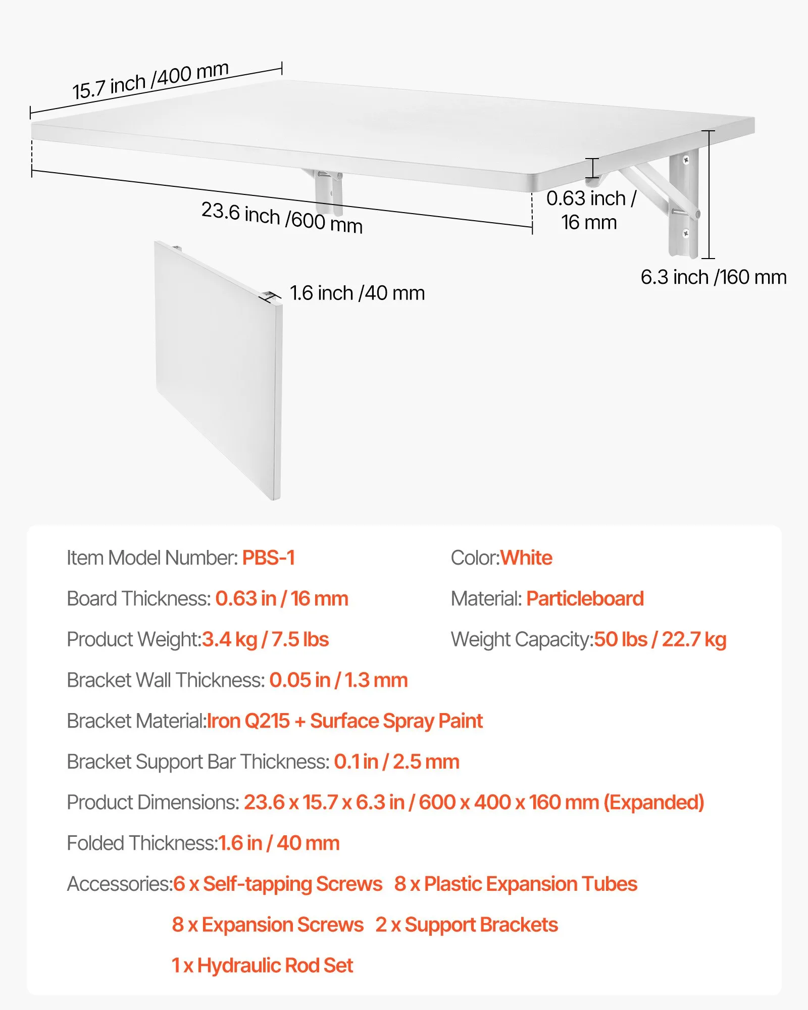 Nástenný skladací stôl, 60 x 40 cm, skladací stôl, plávajúci stôl s železnou konzolou, skladací stôl do malých priestorov, domáca kancelária, jedáleň, práčovňa, kuchyňa, bar, biely