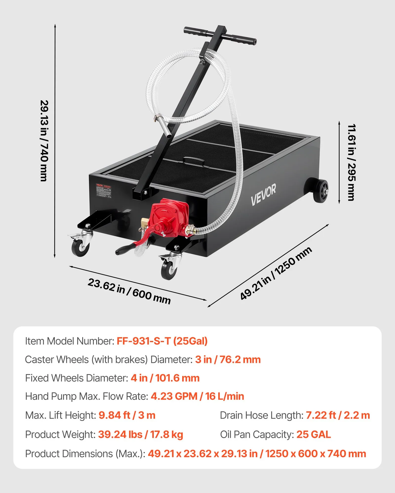 Veľká kapacita 94,6 l (25 galónov): Olejová vaňa s objemom 94,6 l (25 galónov) pojme olej z viacerých vozidiel naraz. Hadica s dĺžkou 2,2 m zaisťuje rovnomerné vypúšťanie, vďaka čomu je ideálna pre dielne, farmy a dlhé pracovné cesty.