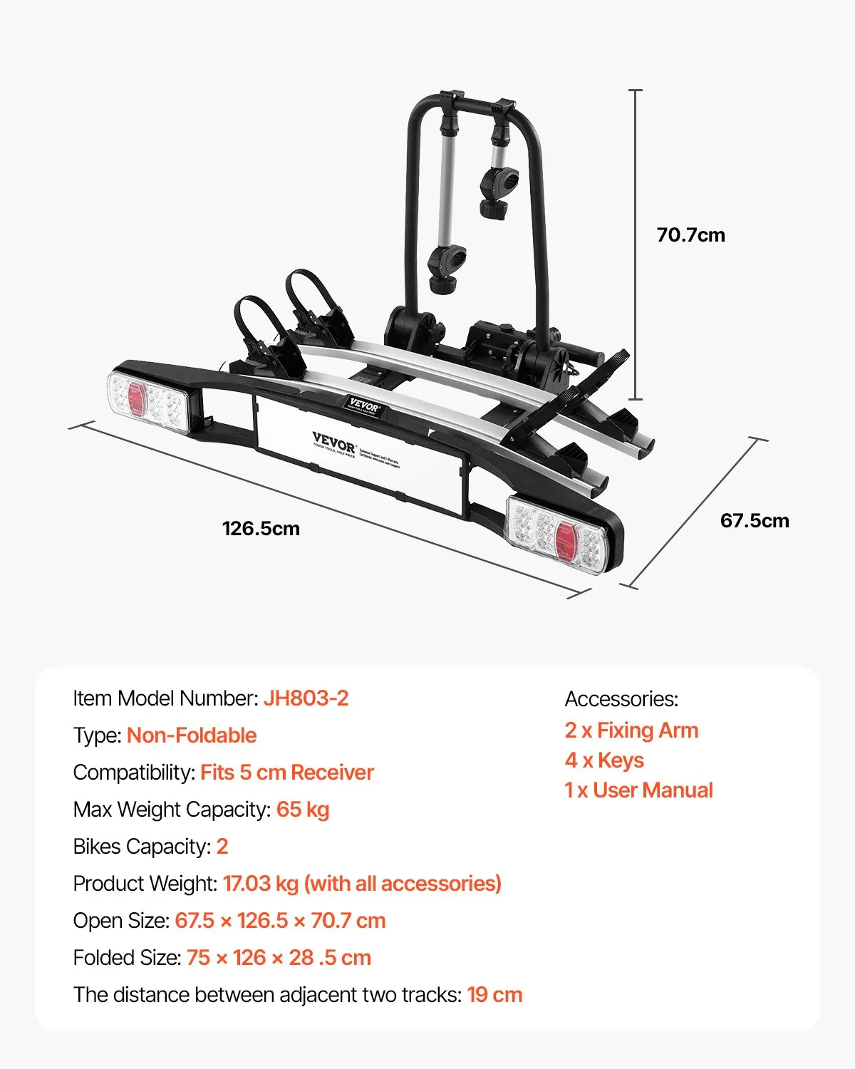 Nosič bicyklov na ťažné zariadenie: Náš nosič bicyklov unesie až 65 kg a bezpečne udrží dva bicykle. Či už na hladkých mestských uliciach alebo hrboľatých vonkajších chodníkoch, poskytuje spoľahlivú ochranu.