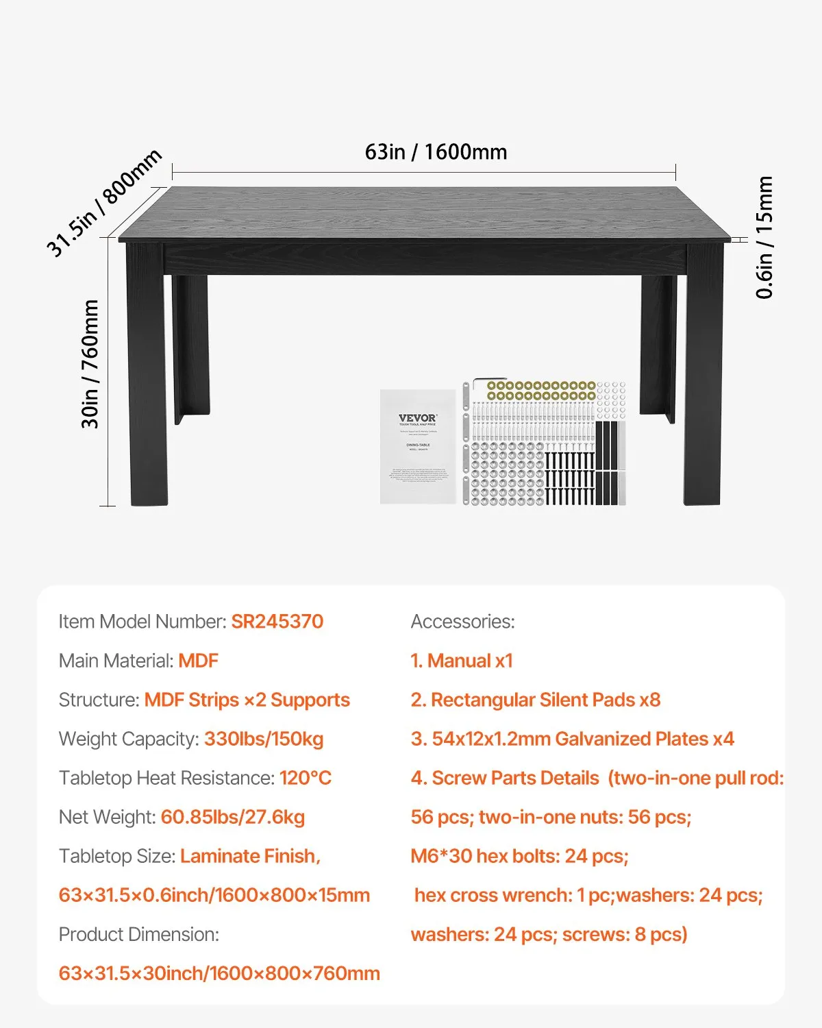 Vysokokvalitné materiály: Doska stola je vyrobená z kombinácie MDF a laminátu, čo jej dodáva nielen elegantný a esteticky príjemný vzhľad, ale aj vynikajúce funkčné vlastnosti. MDF poskytuje pevný, hladký povrch, zatiaľ čo laminátový povrch zvyšuje odolnosť stola voči opotrebovaniu, poškriabaniu a zafarbeniu, čím účinne chráni náš drevený jedálenský stôl pred drobnými škrabancami a zafarbením.
