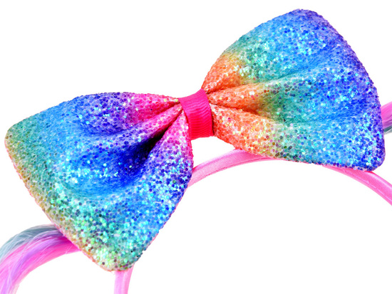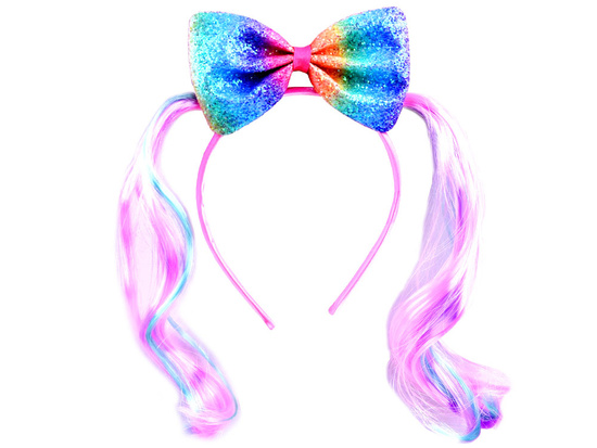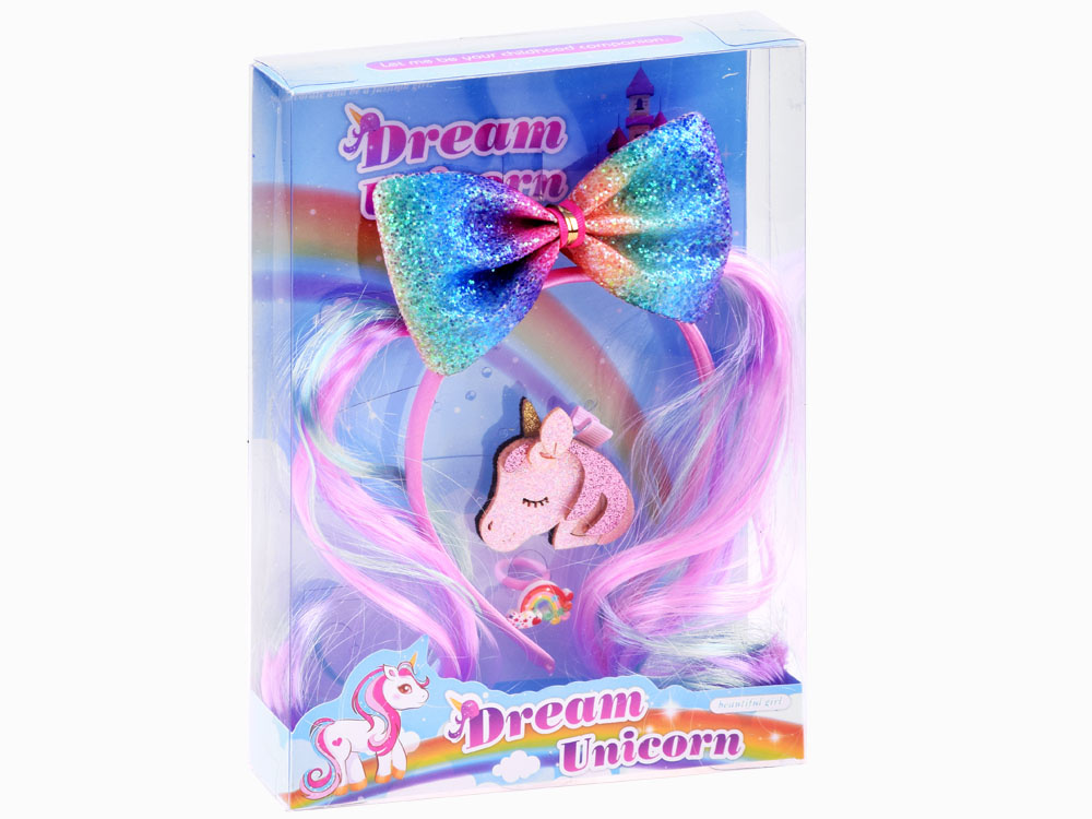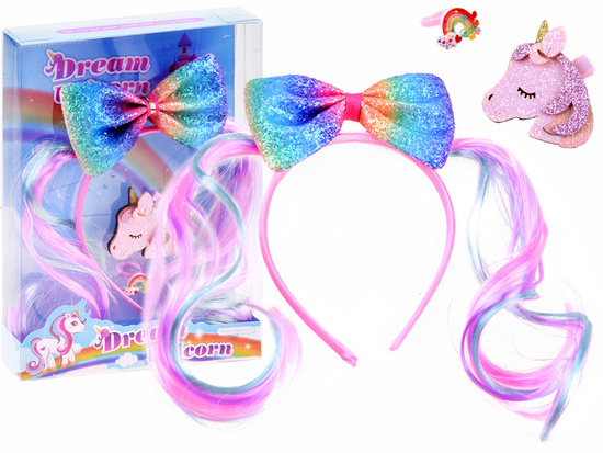 Táto sada čelenky s copíkom a mašľou, sponky do vlasov a prsteňa je perfektná pre každú malú maškrtníčku. Táto sada je ideálna na každodenné úpravy do škôlky, na narodeninovú oslavu, ples alebo prechádzku. Plastová čelenka, lemovaná ružovým saténom, zdobí krásna trblietavá mašľa s farebnými copíkami. Celý vzhľad je možné doplniť trblietavou sponou do vlasov s jednorožcom a plastovým dúhovým prsteňom.