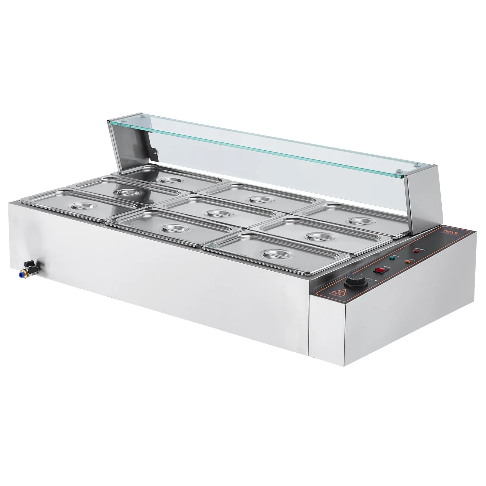 Ohrievač potravín pre firmy (6 x 1/2 nádoby), elektrický ohrievač z nehrdzavejúcej ocele s výkonom 1,5 kW so skleneným krytom a naberačkou, hrnce na grilovanie na catering, do reštaurácie, na párty