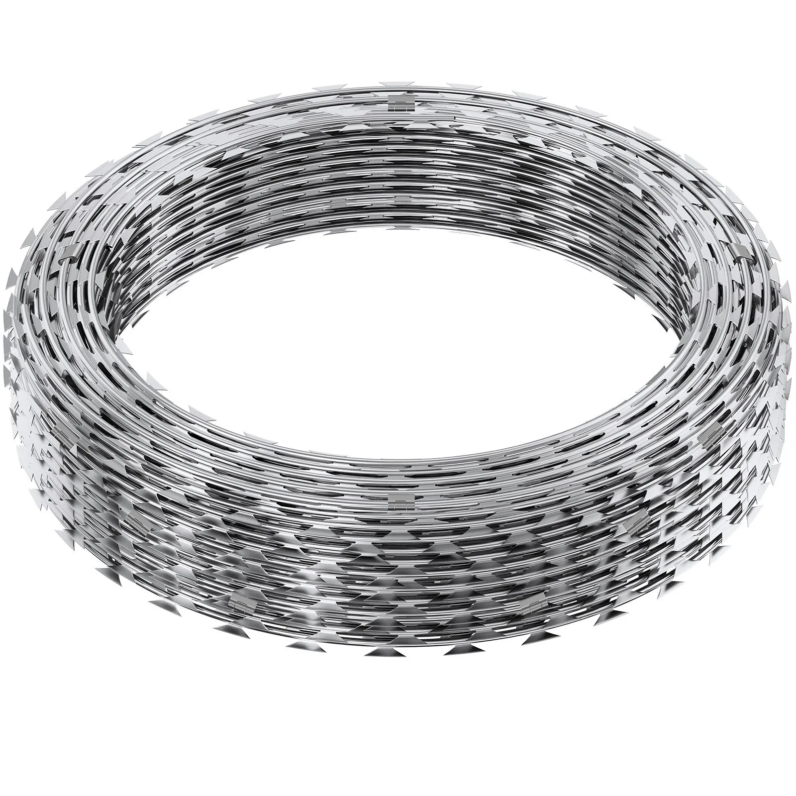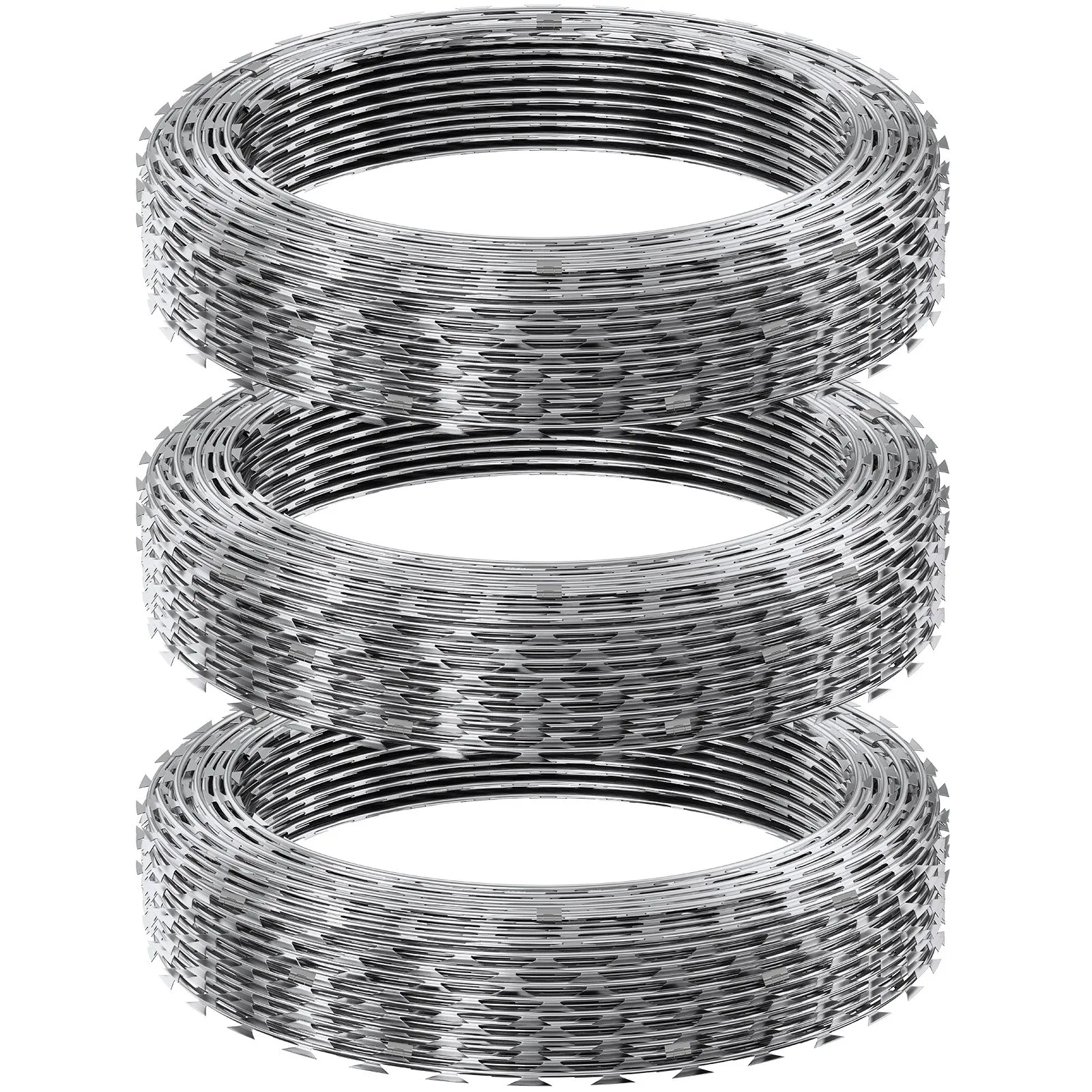 • Ostré žiletky: Náš žiletkový drôt má žiletky s hrúbkou 0,02 palca (0,51 mm) a šírkou 0,98 palca (približne 25 mm), ktoré poskytujú vynikajúcu ochranu. Dlhšie a ostrejšie čepele s dvojitou špirálovou konštrukciou zvyšujú bezpečnosť a účinne odrádzajú votrelcov.