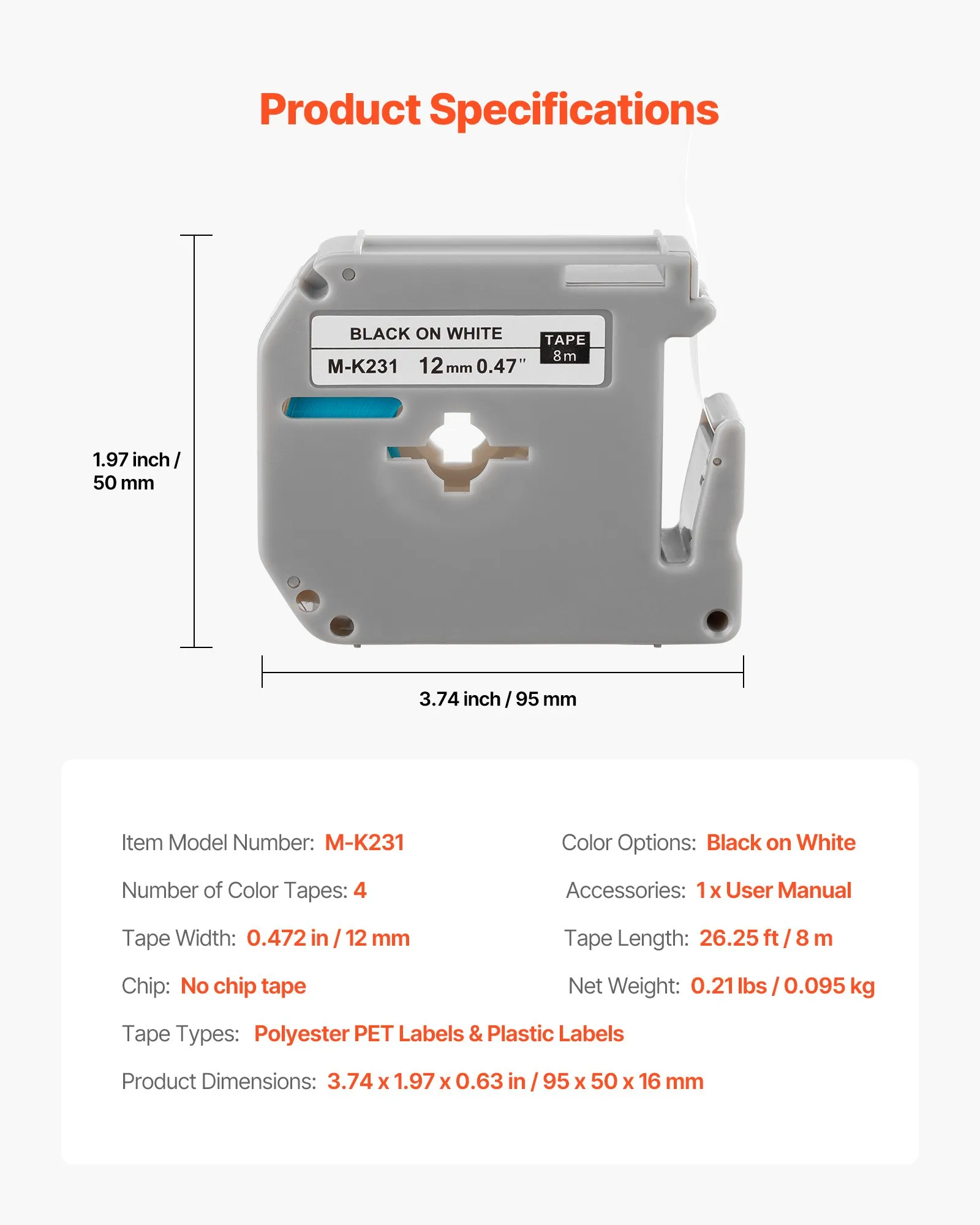 Široká kompatibilita: Táto čiernobiela páska na etikety je kompatibilná s farebnou páskou Brother M-K231 a bez námahy splní všetky vaše rozmanité tlačové potreby. Každá rolka má šírku 12 mm a dĺžku 8 m a je vhodná pre zariadenia Brother, ako sú PT-M95, PT-90, PT-70BM, PT-85, PT-80 a ďalšie. Je to ideálna páska na etikety pre všetky vaše potreby v kancelárii a domácnosti.