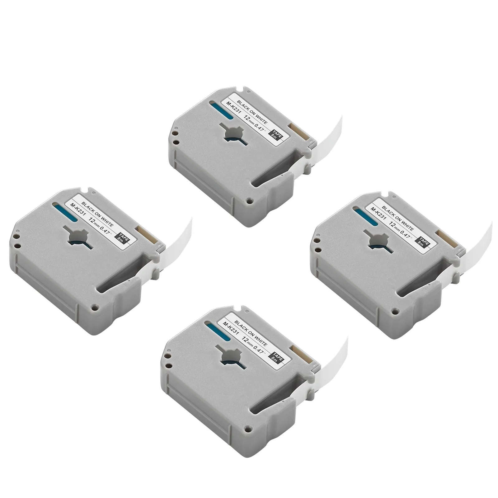 Páska na štítky, balenie 4 kusov, šírka 12 mm, čierna na bielom podklade, kompatibilná s rôznymi štítkovačmi Brother, PT-M95, PT-90, PT-70BM, PT-85, PT-80, náhrada za M-K231