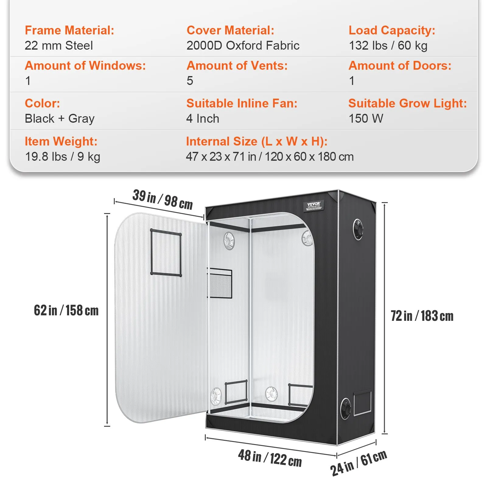 Vystrihnutý z inej látky: Náš pestovateľský stan je vyrobený z vysoko kvalitnej, odolnej proti roztrhnutiu oxfordskej látky 2000D, ktorá má vyššiu hustotu a ponúka lepšiu blokádu svetla ako 600D. Vnútorná vrstva stanu je vyrobená zo 100 % reflexného Mylaru, ktorý poskytuje vašim rastlinám dokonalé prostredie pre rast.