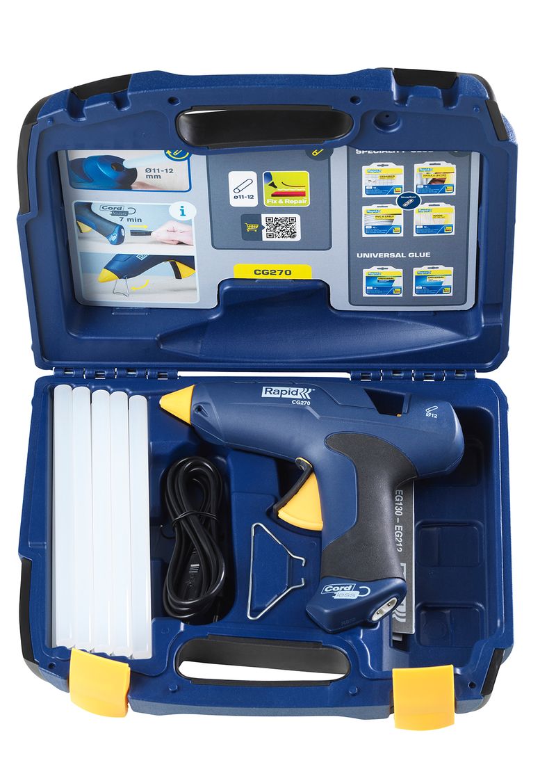 Ideálna lepiaca pištoľ RAPID CG270 pre široký rad prác vo vnútri aj vonku. CG270 ponúka veľký užívateľský komfort vďaka svojej bezkáblovej prevádzke v dĺžke až 7 minút. Medzi ďalšie výhody patrí zlepšený dávkovací a spúšťací mechanizmus, navrhnutý pre zvýšenú, ale plynulejšiu aplikáciu lepidla. Vysoký lepiaci výkon vám umožňuje pracovať efektívnejšie pri vysokej rýchlosti. Výmenná tryska (dodávaná zvlášť) umožňuje nanášať linky a body lepidla so zvýšenou presnosťou. Lepiaca pištoľ sa dodáva v pohotovom ochrannom skladovacom a prepravnom púzdre, ktoré zahŕňa návod na rýchly štart, ktorý vám umožňuje správ ne používať nástroj a nájsť správne lepidlo, keď je nutné ho doplniť.
