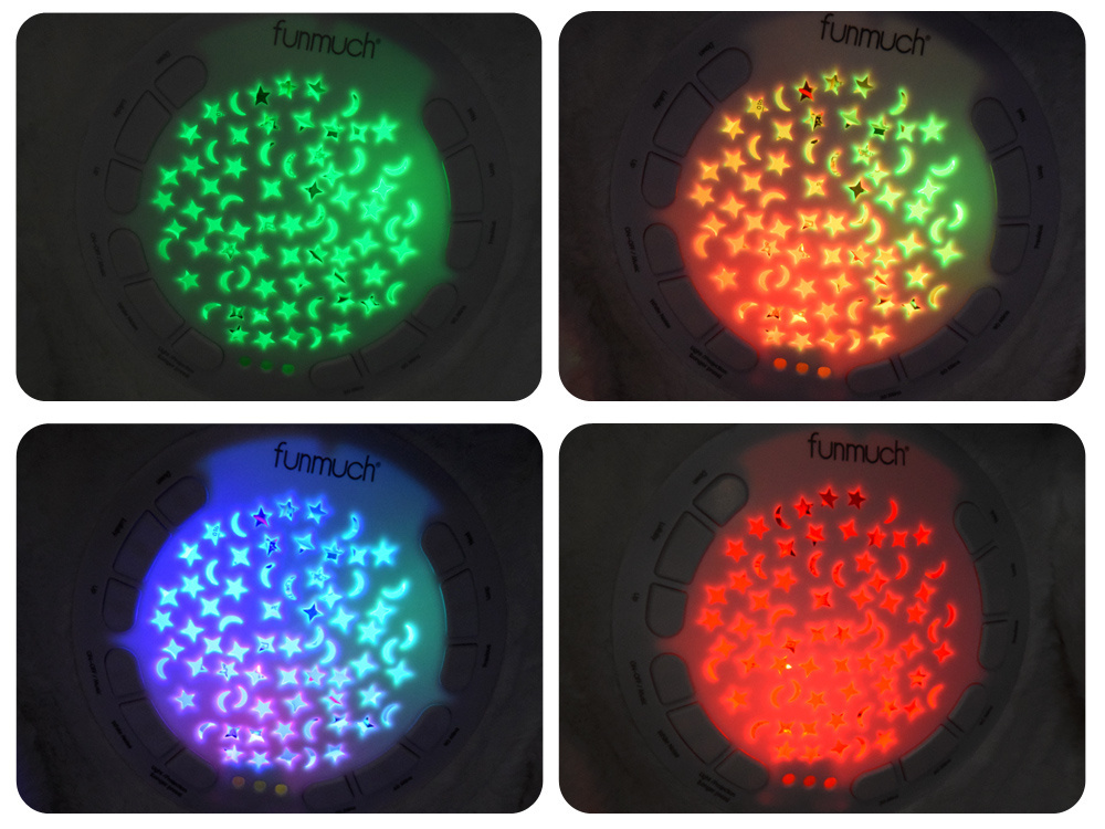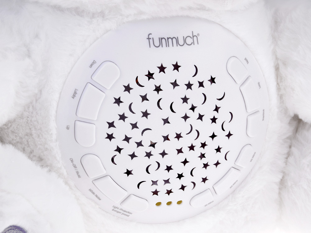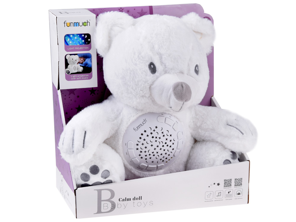 Tento projektor s motívom medvedíka so zvukovými efektmi je perfektným doplnkom do detskej izby a môže sa stať aj útulným priateľom pre vaše dieťatko kedykoľvek počas dňa alebo noci. Tento medvedík upokojí vaše dieťatko svojimi jemnými, pokojnými melódiami. Farebné svetielka, ktoré vytvárajú hviezdy a mesiace, naplnia izbu vášho dieťaťa a vytvoria skutočnú krajinu snov.