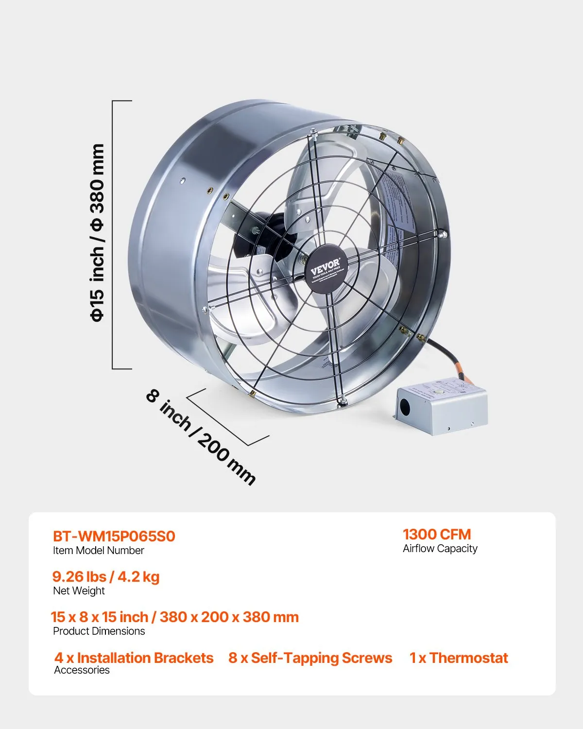 Podkrovný odsávací ventilátor, 380 x 200 mm, odsávací ventilátor s nastaviteľným termostatom, vonkajšia mriežka, prietok vzduchu 1300 CFM, pre štíty, strechy, garáže, dielne a domy