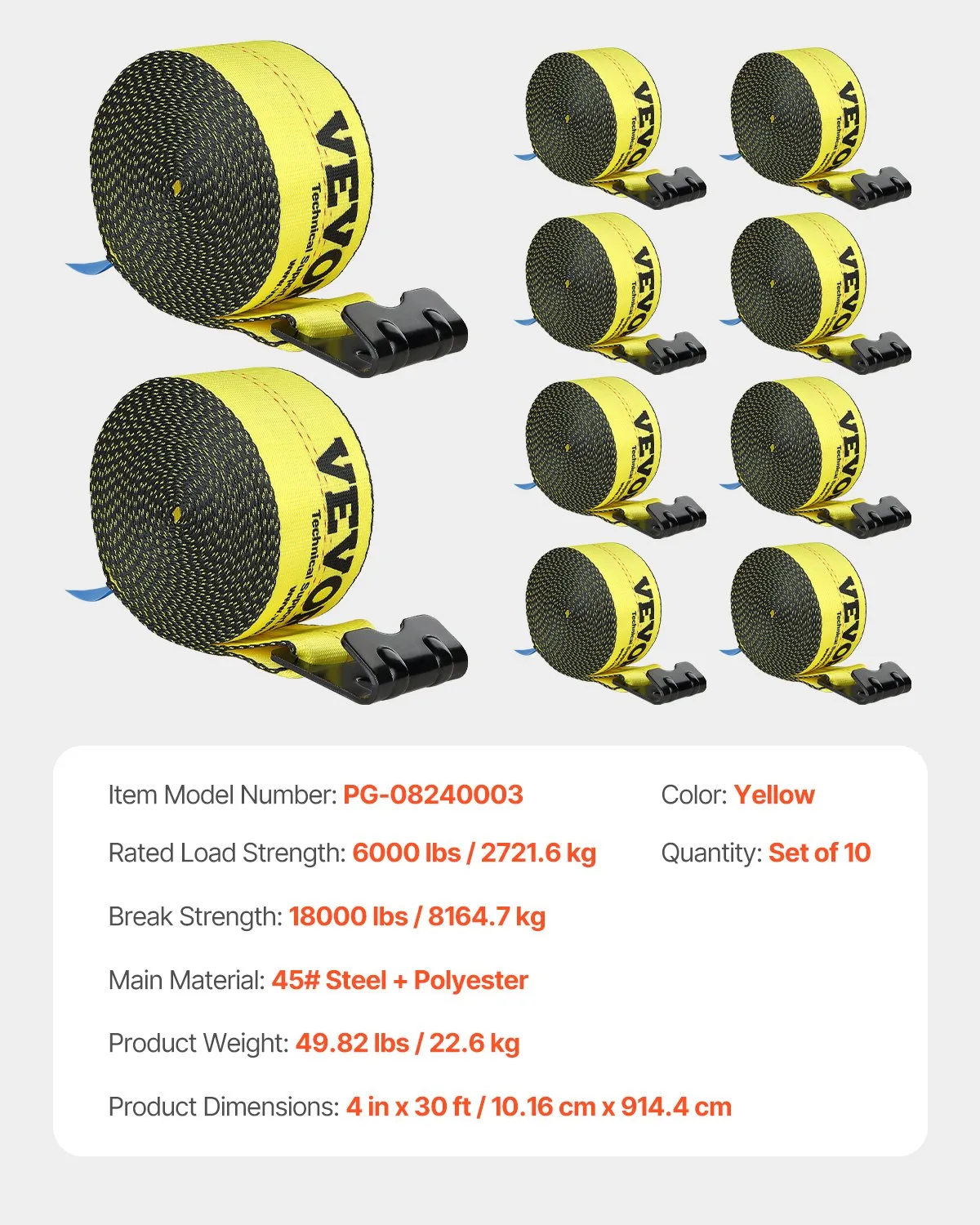 Popruhy na navijak, 4″ x 30′, nosnosť 6000 libier, pevnosť v ťahu 18000 libier, popruhy pre nákladné vozidlá s plochým hákom, kontrola záťaže pre prívesy, farmy, záchranné služby, šetrič stromov, žlté (balenie 10 ks)