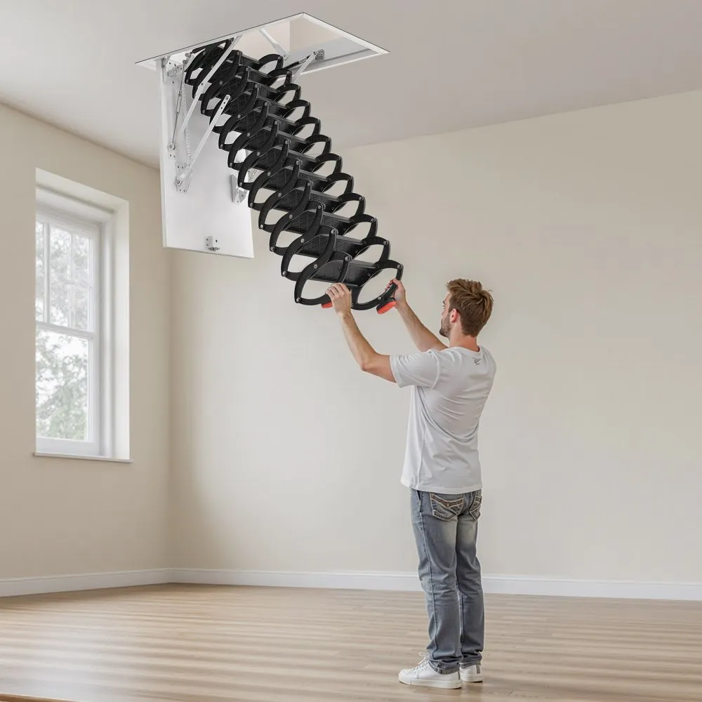 Montáž na strop: Tento oceľový podkrovný rebrík je určený pre hrúbky stropov ≥ 13 cm a výšky 2,9 – 3,1 m a ponúka 5 cm odstupu od steny pre rôzne usporiadania miestností. Vyrežte otvor s rozmermi 1 000,76 x 698,5 mm, vyvŕtajte, zdvihnite rebrík a upevnite ho skrutkami. (Vyžaduje sa montáž na nosný povrch!)