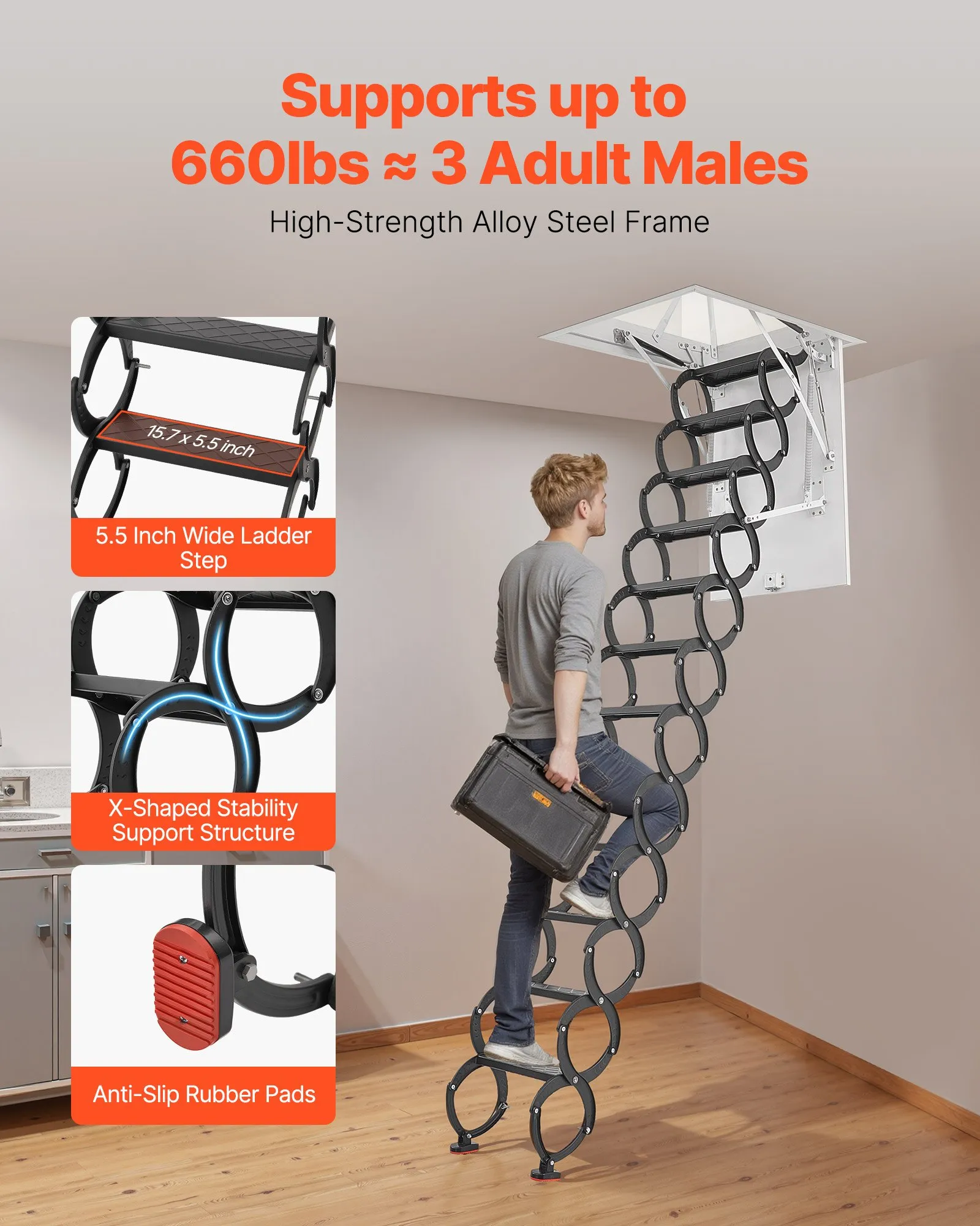 Nosnosť 299,4 kg: Tento rebrík vyrobený z nárazuvzdornej legovanej ocele s robustnými pántami a nosnými tyčami si zachováva stabilitu aj po opakovanom použití. Rám v tvare X poskytuje dodatočnú stabilitu a protišmykové gumené nožičky zabraňujú šmýkaniu. Stupne široké 14 cm zaisťujú lepšiu rovnováhu a ľahšie lezenie.