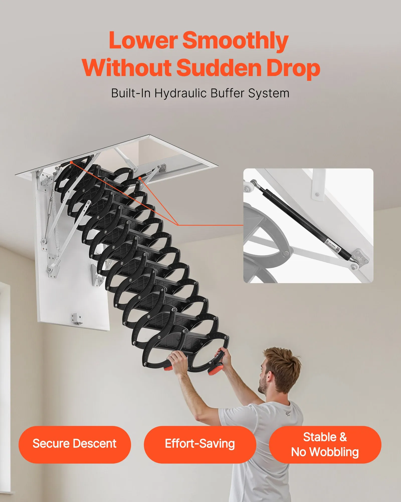Hydraulická asistencia pre bezpečné používanie: Vylepšené dvojité hydraulické tyče umožňujú pomalé a rovnomerné spúšťanie rebríka, čím sa predchádza náhlym pádom. To šetrí námahu počas používania, vďaka čomu je ideálny pre starších ľudí alebo ľudí s obmedzenými silami.