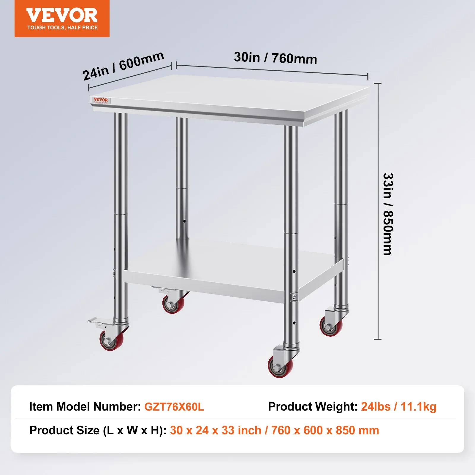 Pracovný stôl 76 x 60 x 85 cm z nehrdzavejúcej ocele, cateringový pracovný stôl s nosnosťou 317 kg, stôl na prípravu jedla s presahom, komerčný kuchynský stôl k baru, mobilný
