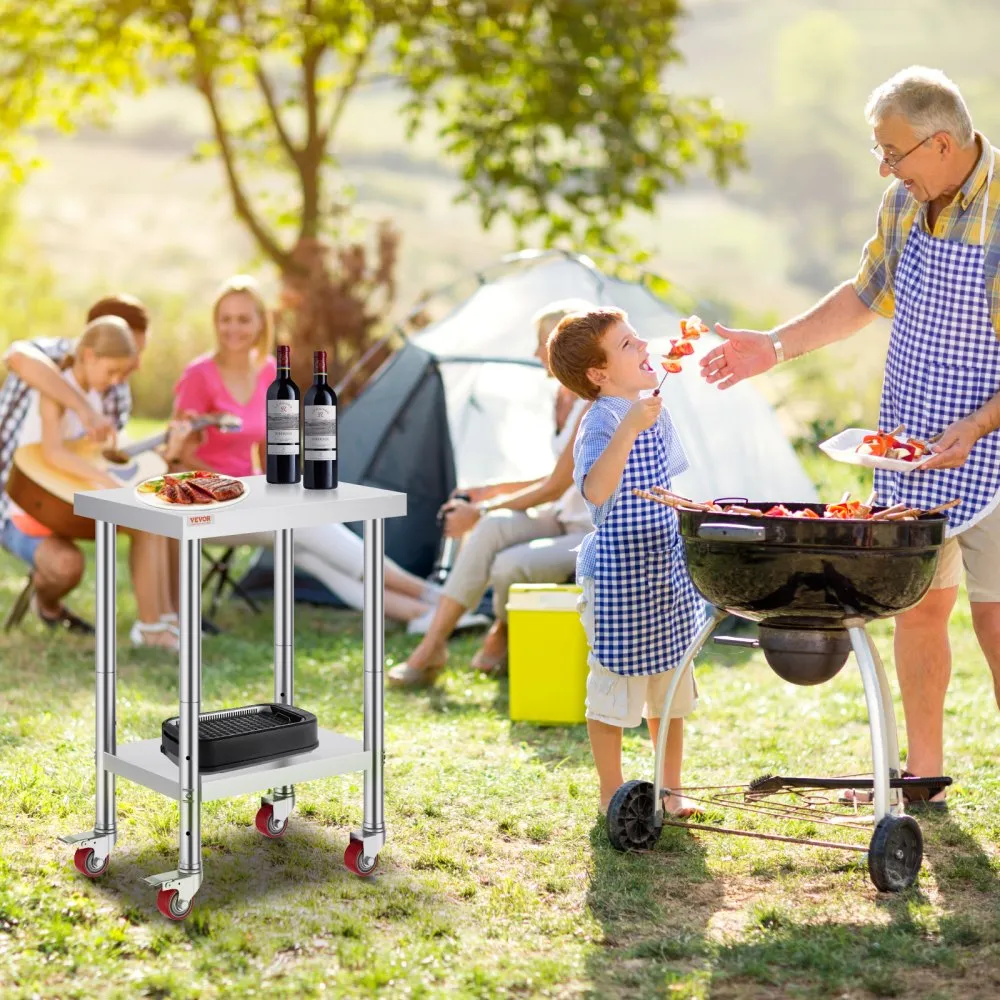 Nosnosť 150 kg: Horná polica: 100 kg; spodná polica: 50 kg. Horná polica: 61 x 46 x 5,5 cm; spodná polica: 48 x 33 x 4,5 cm. Kuchynský stôl z nehrdzavejúcej ocele poskytuje priestrannú plochu na prípravu a skladovanie jedál. K dispozícii je aj spodná polica pre ďalší úložný priestor. Tu si môžete uložiť múku, cukor, dezinfekčný prostriedok, utierky, misky na miešanie, dosky na krájanie a oveľa viac, takže všetky najčastejšie používané pomôcky budete mať usporiadané a ľahko dostupné.
