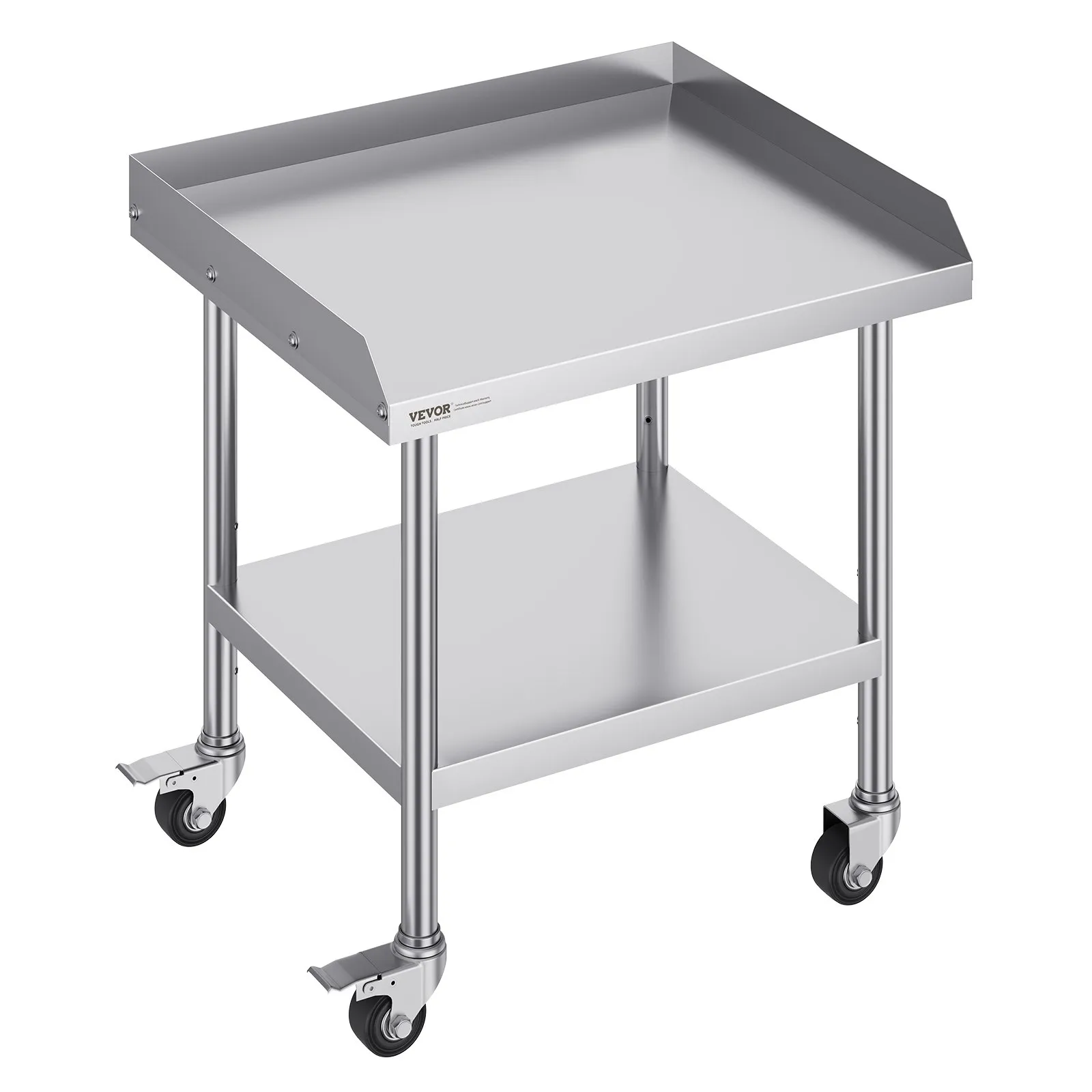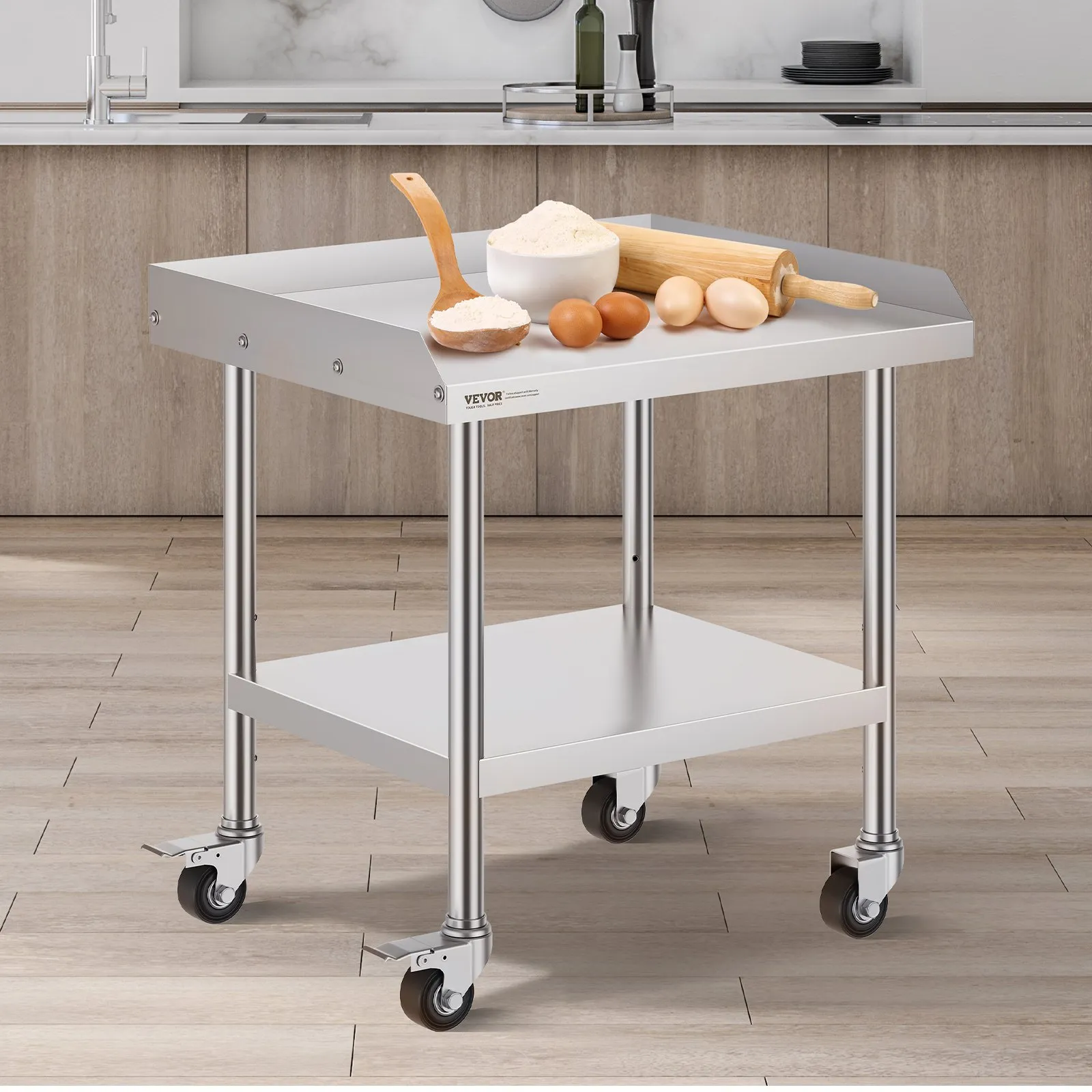 Pracovný stôl z nehrdzavejúcej ocele, 610 x 711 x 762 mm, pracovný stôl na prípravu jedla so 4 kolieskami, otočné kolieska, 3-stranná ochrana proti striekajúcej vode, kovový pracovný stôl do reštaurácií