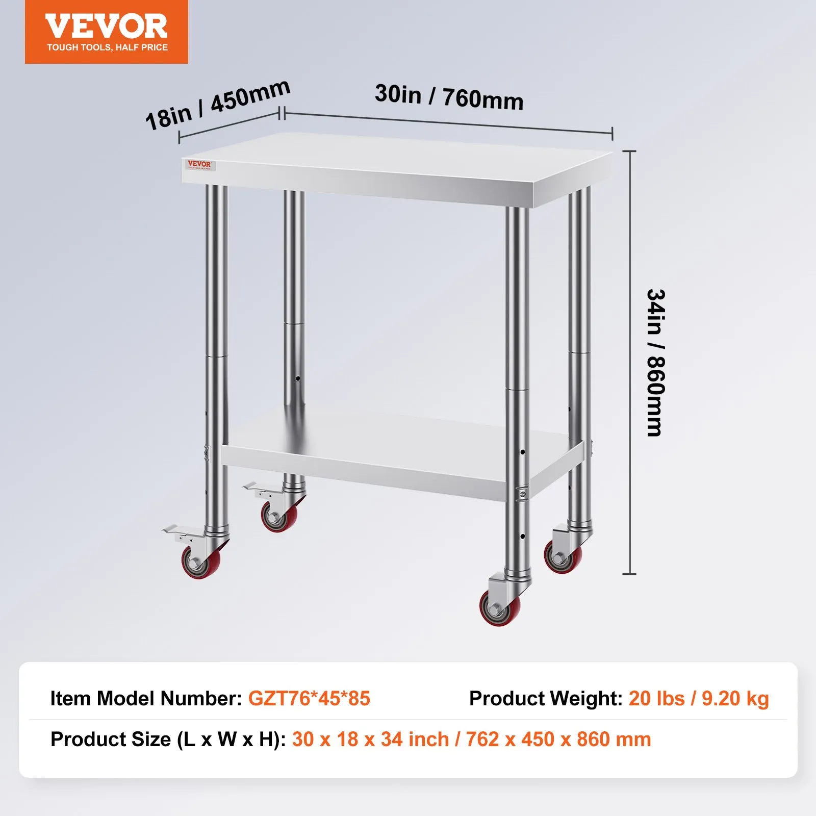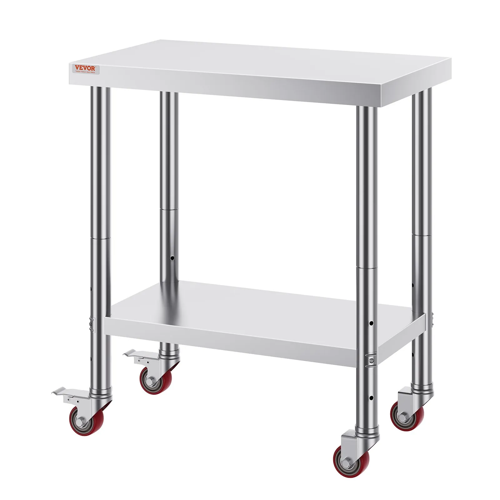 Pracovný stôl z nehrdzavejúcej ocele pre catering 762 x 457,2 x 863,6 mm, nosnosť cca 150 kg, stôl na prípravu jedla, komerčný pracovný stôl do kuchyne, baru, reštaurácie, 4 nastaviteľné nohy
