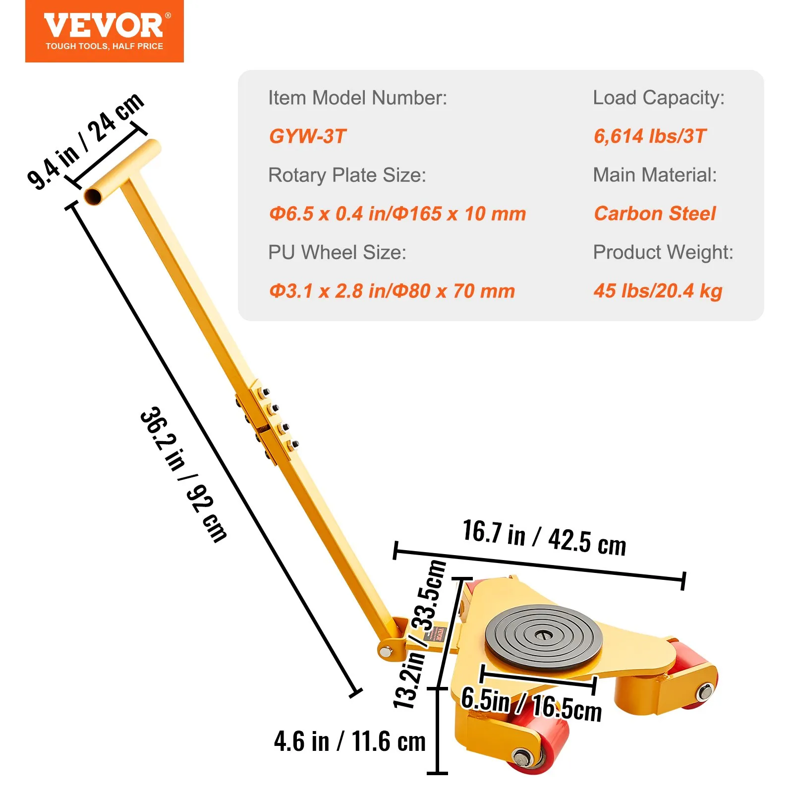 Nosnosť 3 tony: Prepravný vozík dokáže bez námahy naložiť a prepravovať ťažké priemyselné bremená s hmotnosťou až 3 tony, ako sú stroje, priemyselné zariadenia, nadrozmerné krabice a ďalšie. Celá konštrukcia je vystužená bezpečnostnými skrutkami, vďaka čomu je robustnejšia, aby sa zabezpečila bezpečná preprava tovaru. Dlhá rukoväť šetriaca prácu uľahčuje manipuláciu.