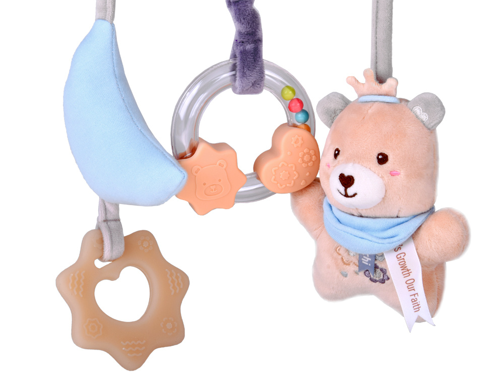 - Rôzne prvky – plyšový medvedík, mäkký, šuštiaci mesiac, silikónové hryzátko v tvare hviezdy a priehľadná hrkálka s farebnými loptičkami.