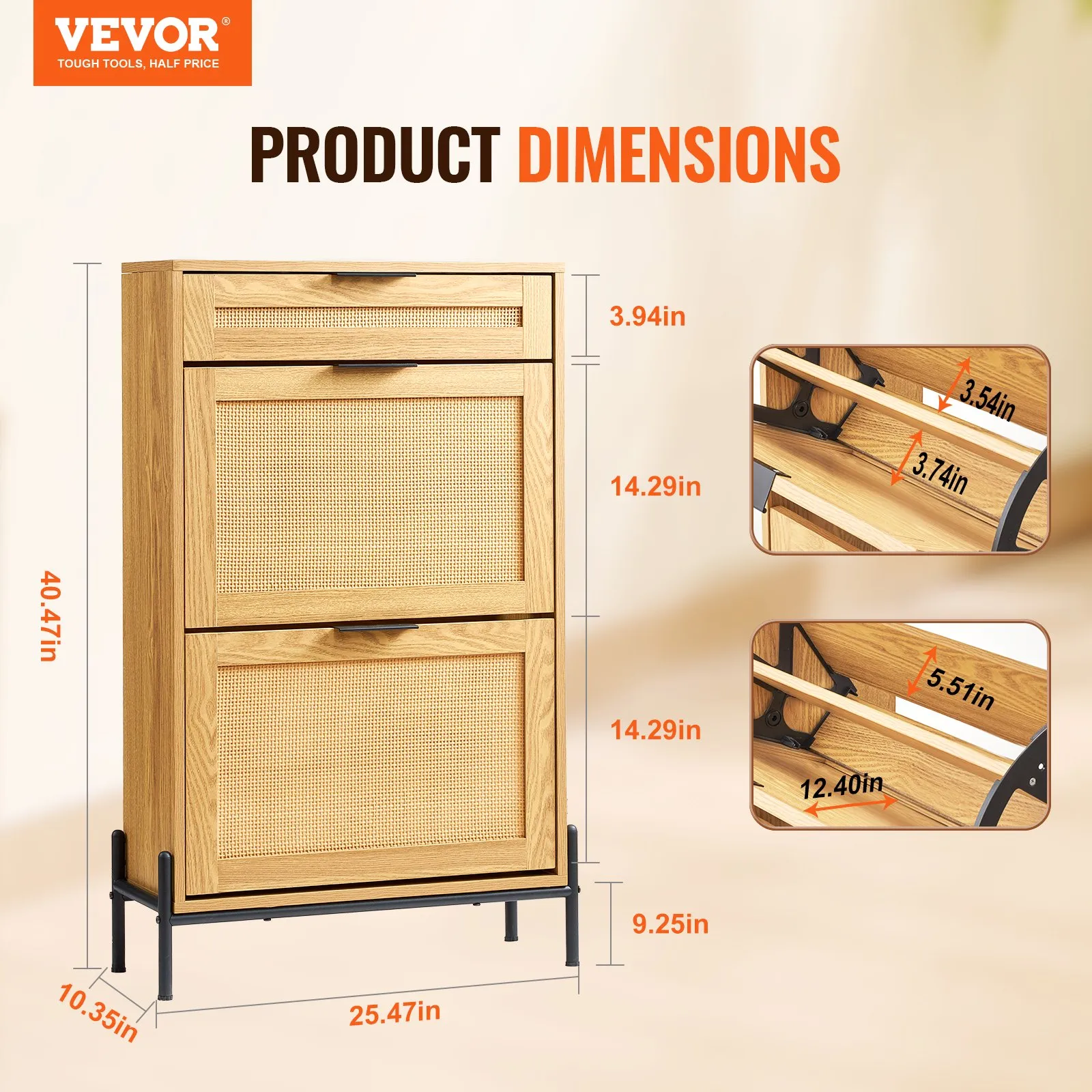 Vynikajúci úložný priestor šetriaci priestor: Táto ratanová skrinka na topánky s inovatívnym, priestorovo úsporným dizajnom vám umožňuje jednoduchý prístup k vašim obľúbeným topánkam a zároveň ich úhľadne uskladniť, keď ich nepoužívate. Vďaka tomu zostane vaša vstupná hala uprataná.