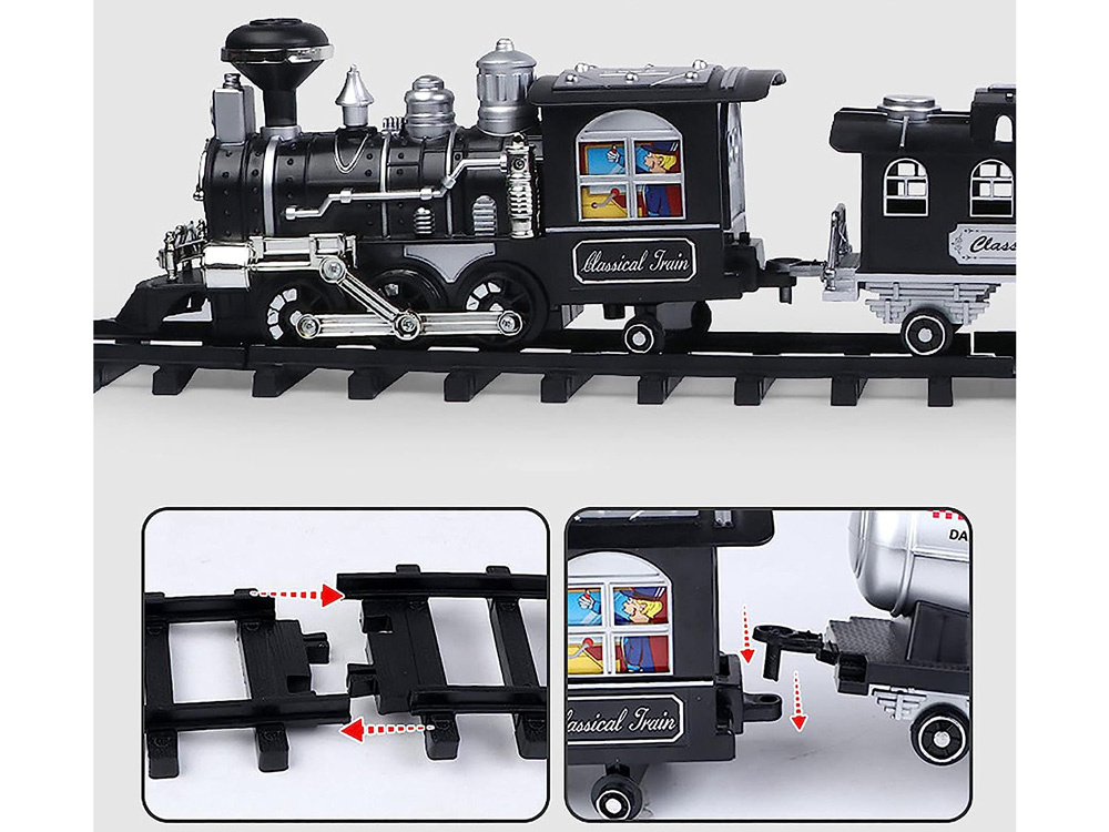 Starostlivo vyrobený s dôrazom na najmenší detail, je poháňaný klasickou parnou lokomotívou, ktorá počas jazdy vydáva zvuky rýchlo idúcej lokomotívy. Naša lokomotíva navyše vpredu bliká výstražným svetlom a po naplnení nádrže vodou sa z komína začne valiť dym, ako sa na staromódny parný stroj patrí. Počas jazdy vydáva aj zvuky, vrátane typického pískania vlaku, klepotania kolies na koľajniciach, zvonenia zvončeka a ďalších zvukov vlakov. Tento nádherný model vlaku s vagónmi určite poteší každého začínajúceho nadšenca modelov vlakov.