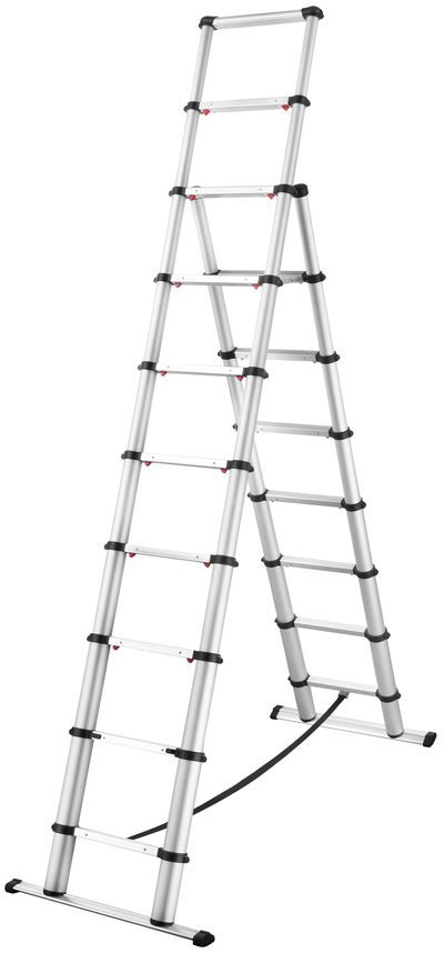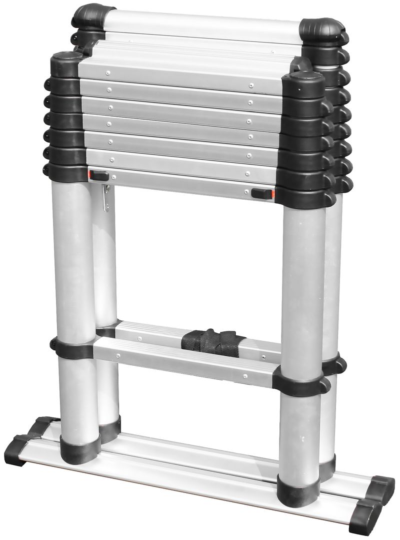 Výsuvný teleskopický rebrík, s ktorým sa dostanete do značnej výšky.Je veľmi dôležité, aby ste si dávali pozor pri jeho používaní.Môžete stratiť rovnováhu.Overte si,že západky sú na ňom správne zaistené. Vedie elektrický prúd, preto s ním nepracujte blízko stĺpov.Vyhýbajte sa stúpaniu a státiu na rebríku vyššie ako meter od vrchu.