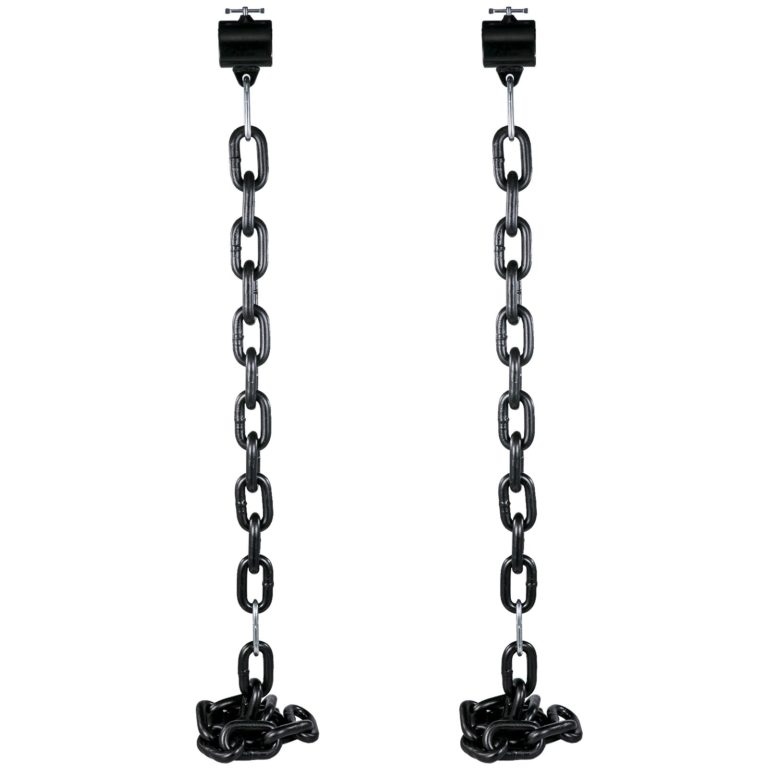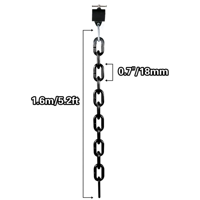 Jednoduché pripojenie – Každá cvičebná reťaz má jeden oceľový čierny golier s L skrutkou na zaistenie zámku. Obojok čiernej tyče má rozmery 5 cm x 8 cm (priemer, dĺžka). Tieto záťažové reťaze na lavičku sa teda dajú ľahko pripevniť na akékoľvek tyče alebo z nich odňať.