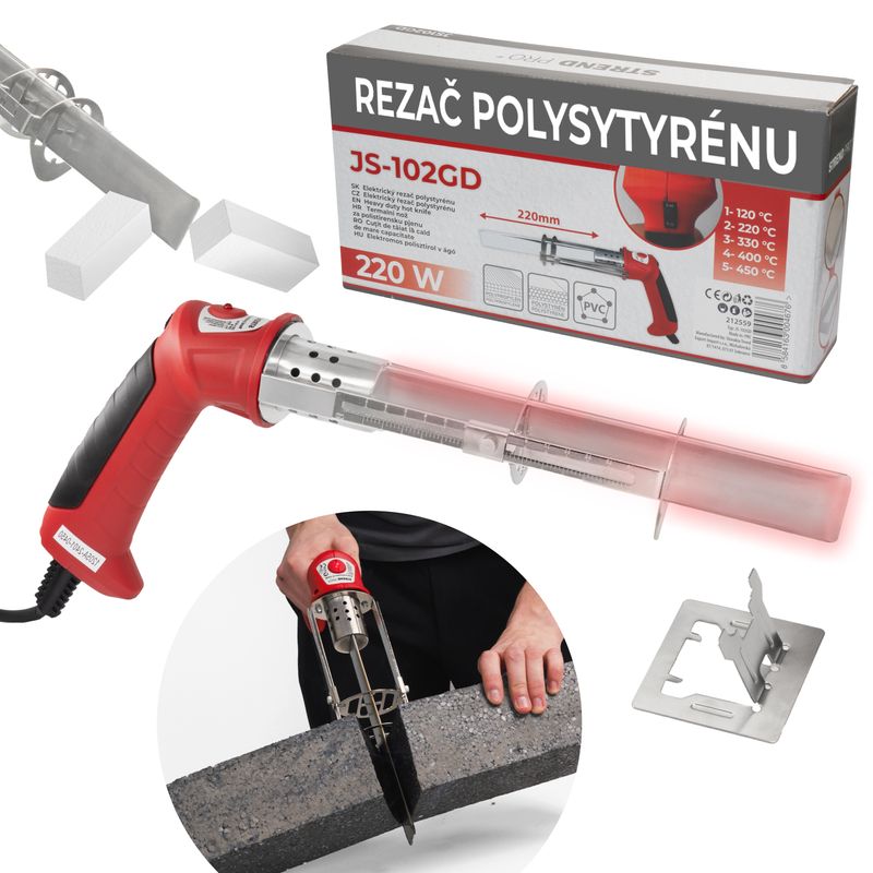 Rezač Strend Pro JS-102GD je určený na rezanie polystyrénu, plastu, montážnej peny či molitanu. O to sa postará kvalitný a ostrý nôž, s ktorým dosiahnete čistý rez. Rezanie materiálov je jednoduché vďaka silnému 220 W motoru. Pomocou nástavca viete nastaviť hrúbku rezania 13 cm alebo 22 cm presne podľa Vašich potrieb. Tvar rezača je prispôsobený na ľahké uchopenie a manipuláciu pre absolútnu precíznosť pri rezaní.