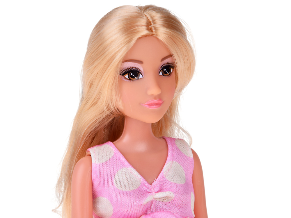 Bábika mama má dlhé, svetlé vlasy, ideálne na česanie a úpravu vlasov. Jemný mejkap zvýrazňuje jej orieškové oči. Má na sebe voľné tehotenské ružové šaty s bodkami a žlté tenisky.
