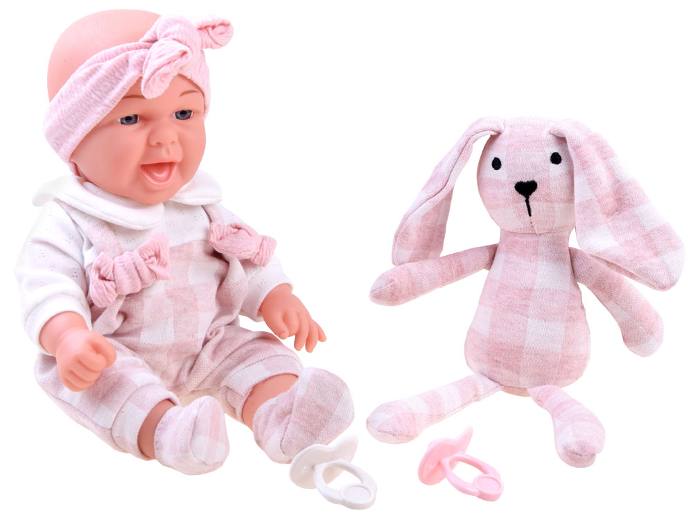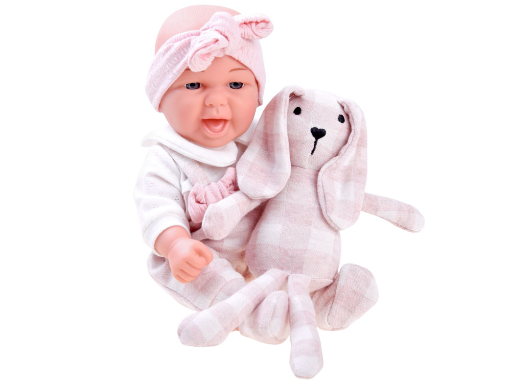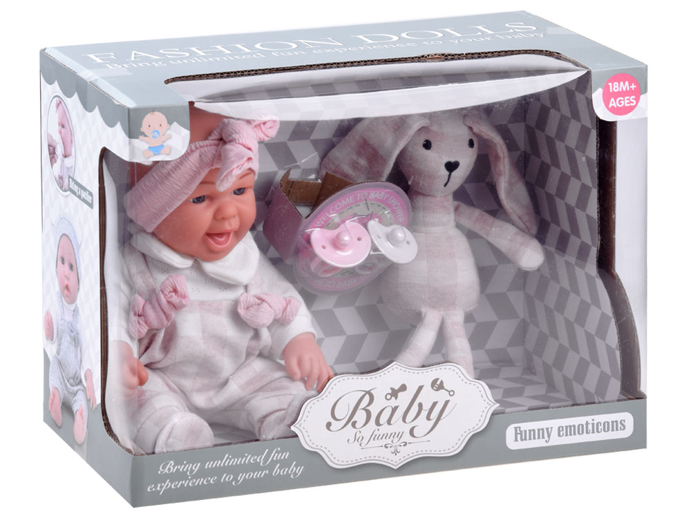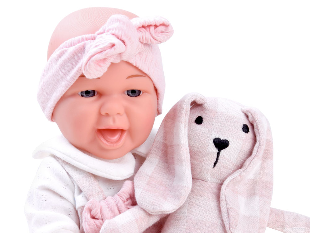 Toto rozkošné bábätko  s plyšovým zajačikom vyzerá presne ako malé bábätko. Určite roztopí srdce nejedného dievčatka. Sada sa vyznačuje krásnou ružovo-bielou farebnou kombináciou. Okrem bábiky a zajačika obsahuje aj dva cumlíky: jeden biely a jeden ružový.