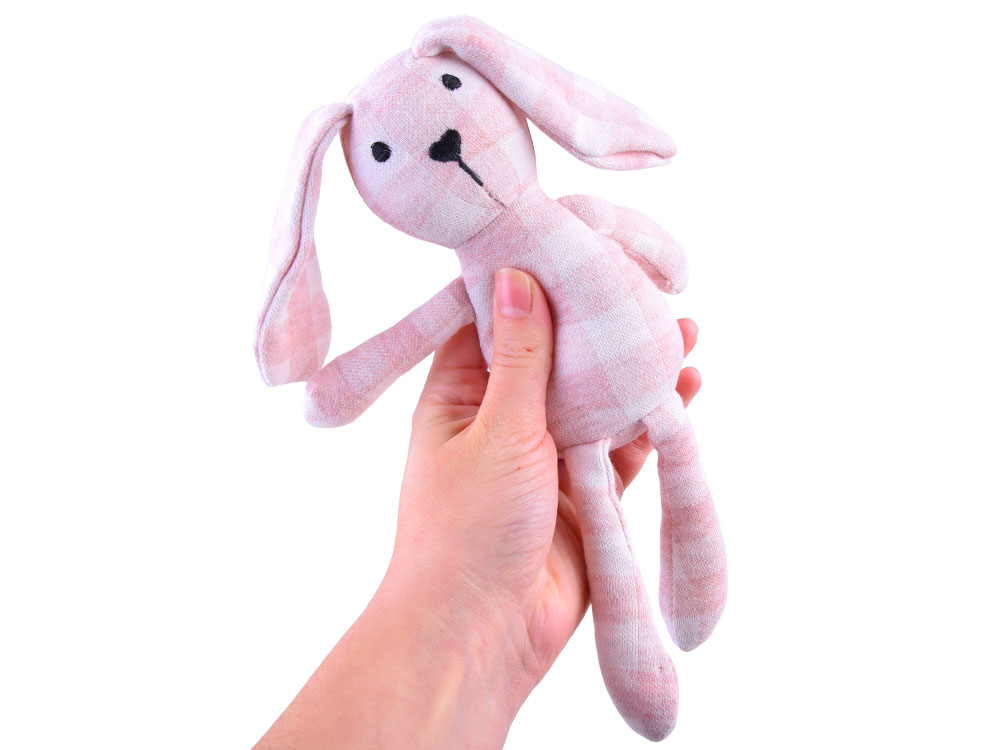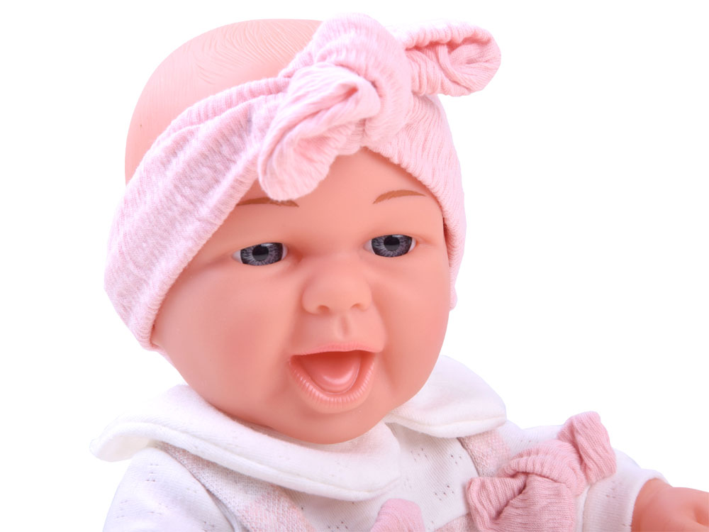 Bábätko je oblečené v ružovo-bielej sade: ružová čelenka, biela blúzka v kombinácii s kockovanými šortkami a biele ponožky. Oblečenie pre bábätko je mäkké a veľmi príjemné na dotyk. Všetky časti sa dajú vybrať, keď chcete svoje drobčeka prezliecť. Plyšový zajačik má vyšívané oči a nos a je vyrobený z rovnakého materiálu ako šortky pre bábätko. Bábätko je krásne vyrobené s dôrazom na každý detail, aby sa čo najviac podobalo skutočnému dieťaťu. Je vyrobené z tvrdého plastu a gumy.