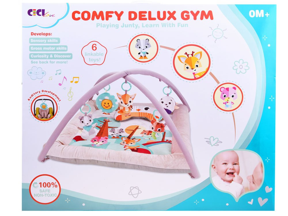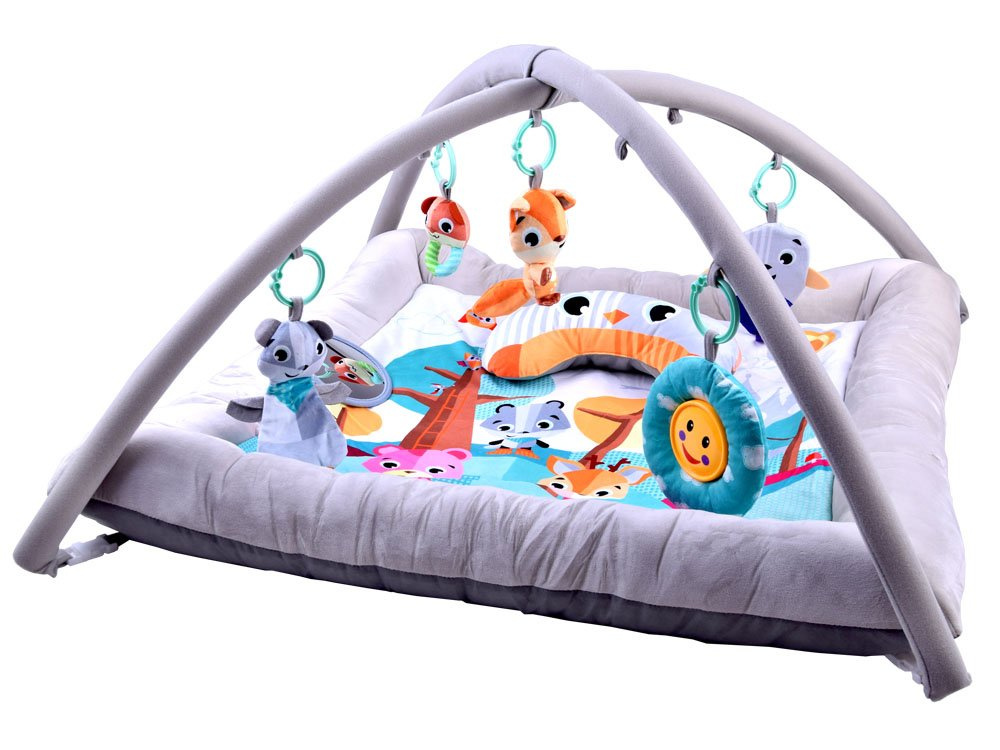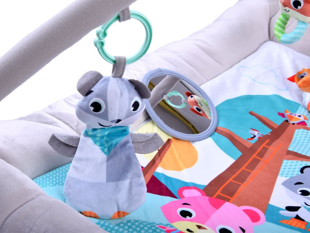 Táto pôvabná, mäkká a elegantná aktivitná podložka pre najmenšie deti osloví bábätká aj rodičov. Podložka je svetlošedá s pôvabnou kontrastnou grafikou. Materiál je mäkký a príjemný na dotyk. Boky podložky sú vyplnené mäkkou výplňou, ktorá chráni bábätko pri gúľaní sa na podložke. Aktivitná podložka je vybavená odnímateľnými oblúkmi, na ktoré sa dajú zavesiť hračky. Hračky visia na plastových krúžkoch. Hračky