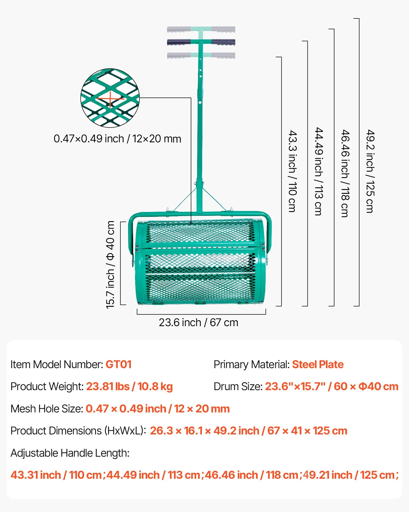 Konzistentný výkon rozmetania: Rozmetadlo semien je vybavené jemným sitom s otvormi 12 x 20 mm (0,47 x 0,49 palca), ktoré zaisťuje rovnomerné rozloženie materiálu. Či už rozmetávate semená, kompost alebo hnojivo, každá plocha je presne pokrytá.