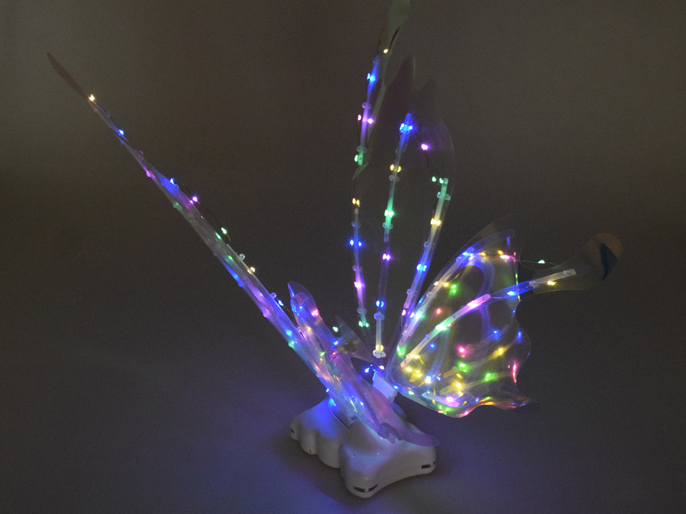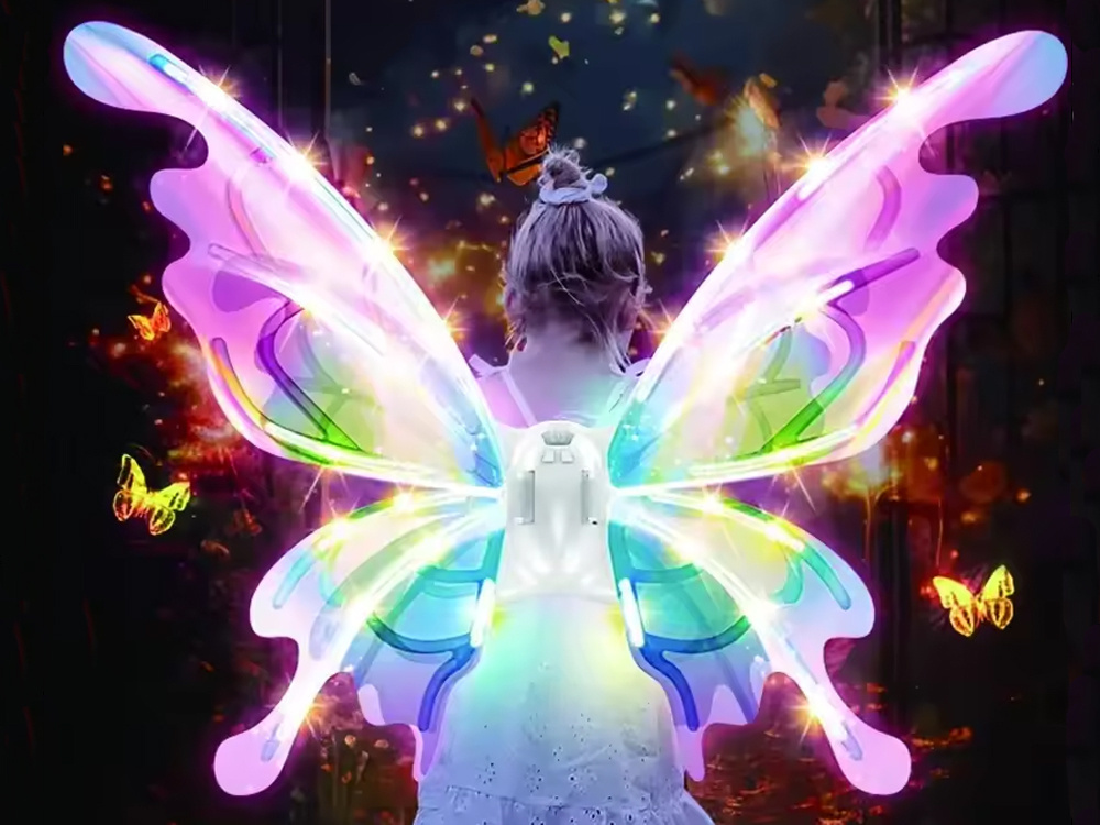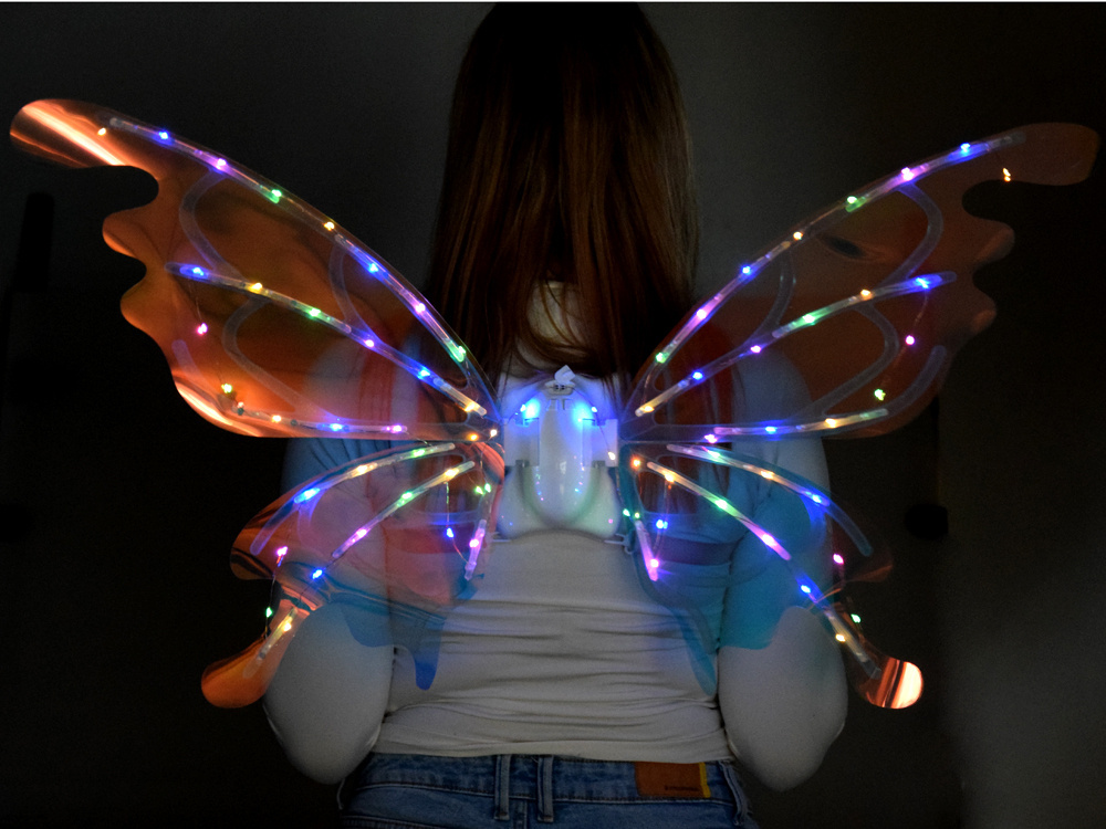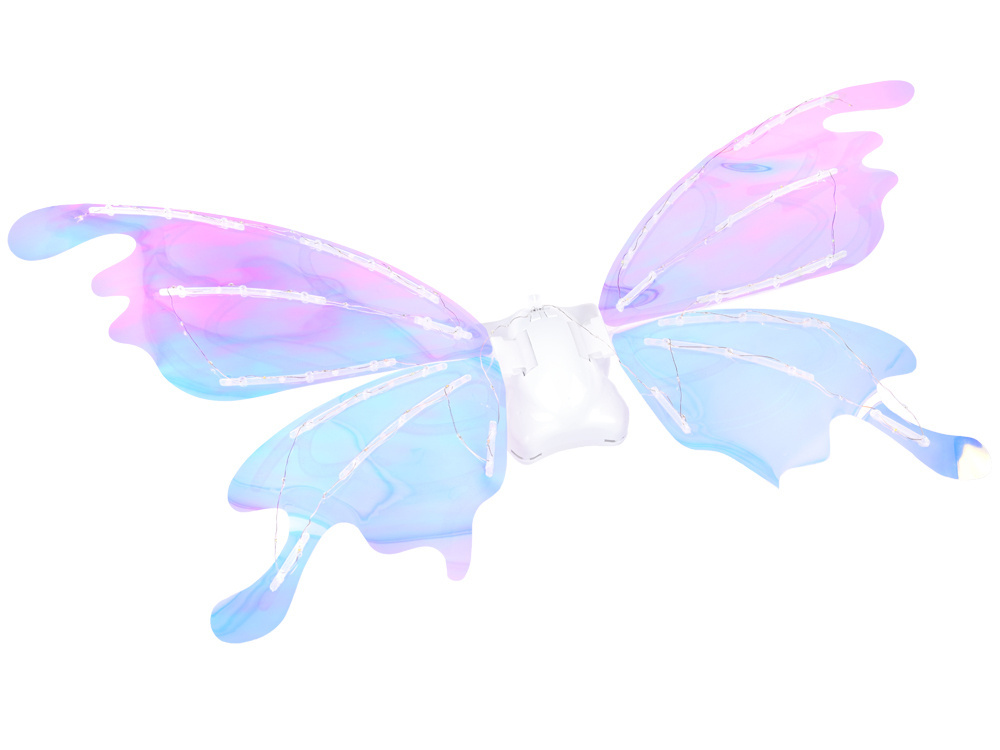 Ich tvar pripomína obrovské motýlie krídla, ktoré sa v závislosti od uhla svetla trblietajú v množstve farieb. Pre umocnenie efektu sú vybavené LED osvetlením, ktoré vytvára neuveriteľný efekt! Malé dievčatká sa môžu cítiť ako skutočné víly z krajiny mágie a zázrakov.