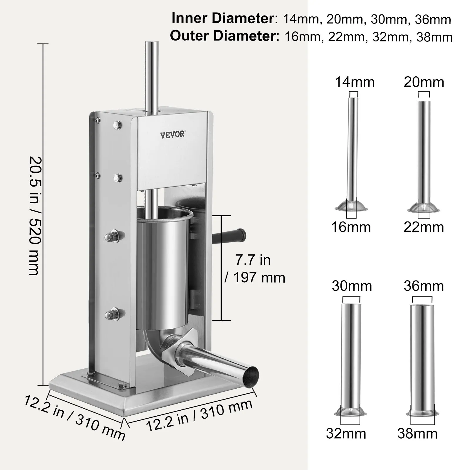 Obsahuje 4 plniace trubice: Táto vertikálna plnička klobás sa dodáva so štyrmi plniacimi trubicami z nehrdzavejúcej ocele (Φ15 mm, Φ21 mm, Φ30 mm, Φ37 mm) a príslušenstvom na výrobu šišiek, ktoré spĺňa rôzne požiadavky na veľkosť pri výrobe tenkých talianskych jemných klobás, ochutených salám alebo hrubších mäsových klobás.