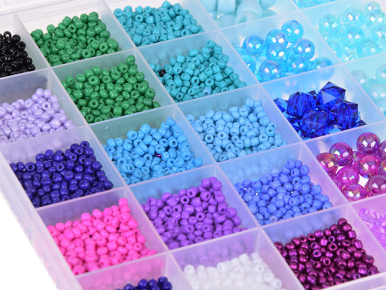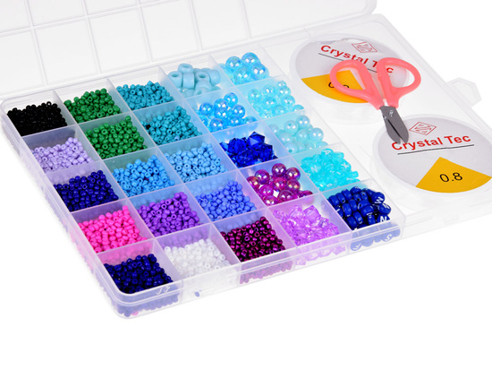 Sada je zabalená v praktickom, priehľadnom puzdre podobnom kufríku, rozdelenom na priehradky, aby sa zabránilo miešaniu korálok.