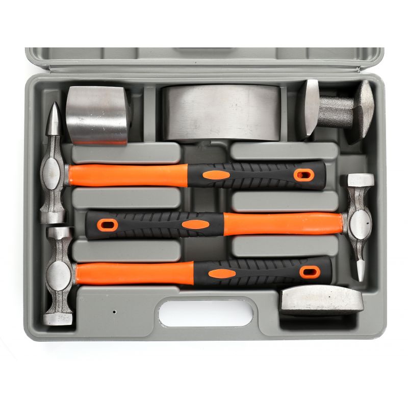 Sada náradia na opracovanie plechu a opravy preliačenej karosérie automobilu. Pracovné roviny nástrojov umožňujú získať v spracovanom materiáli rôzne tvary.