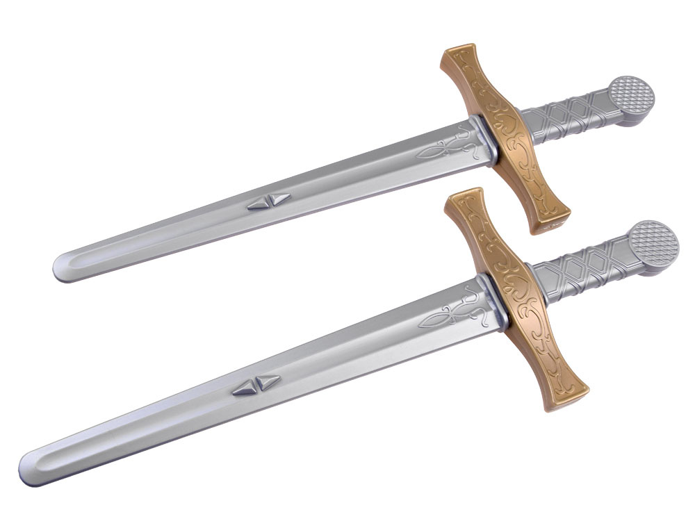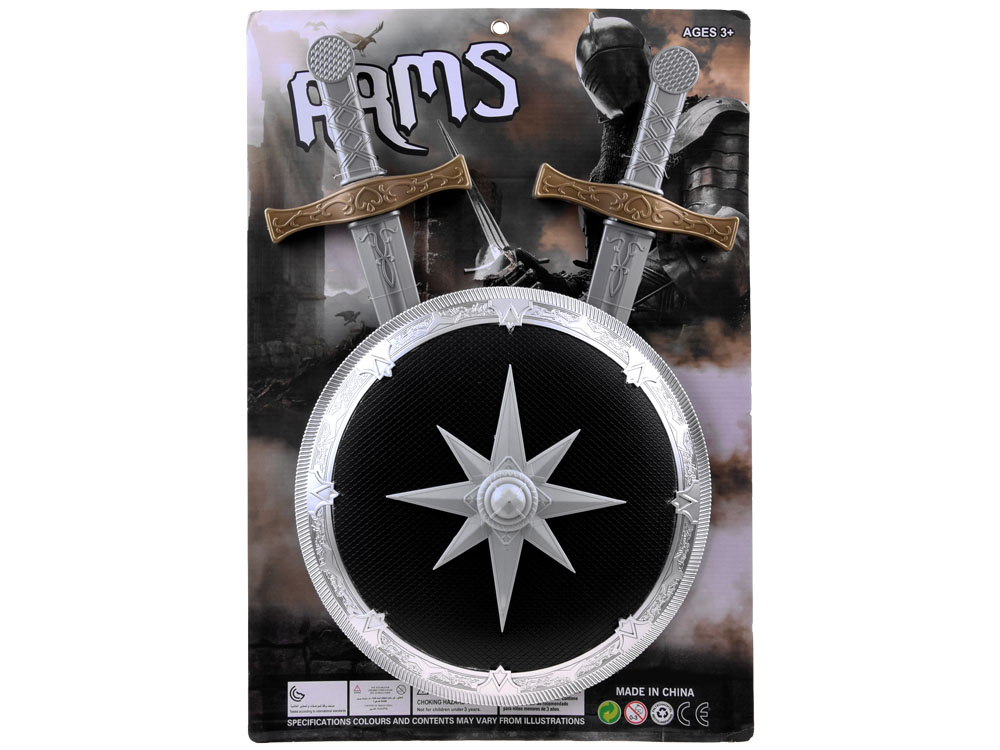 Dva meče a obranný štít sú sada pre každého malého rytiera. Sada je vyrobená celá z plastu a má strieborno-čiernu farebnú kombináciu. Je to perfektná sada pre každého malého rytiera na ples alebo hranie s kamarátmi. Štít s hviezdou na prednej strane má pohodlný úchop na spodnej strane. Meč je ľahký a dutý, čo zabraňuje tomu, aby hračka spôsobila akékoľvek zranenie.