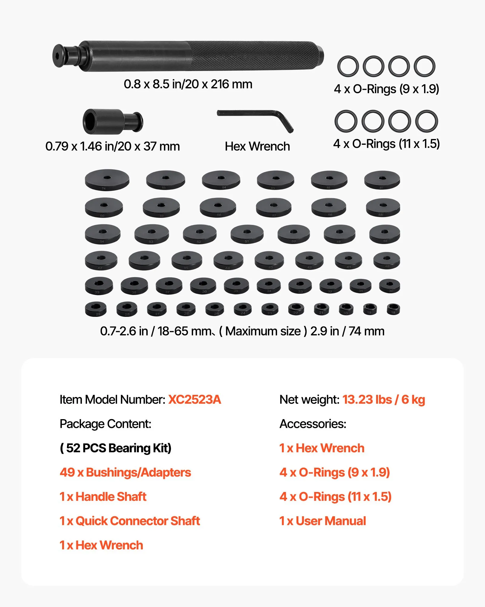 Komplexné veľkosti: Naša sada lisov na ložiská je vhodná na rôzne úlohy demontáže ložísk. Obsahuje 52 kusov bežne používaných veľkostí podložiek a niekoľko montážnych doplnkov pre kompletný nástroj.