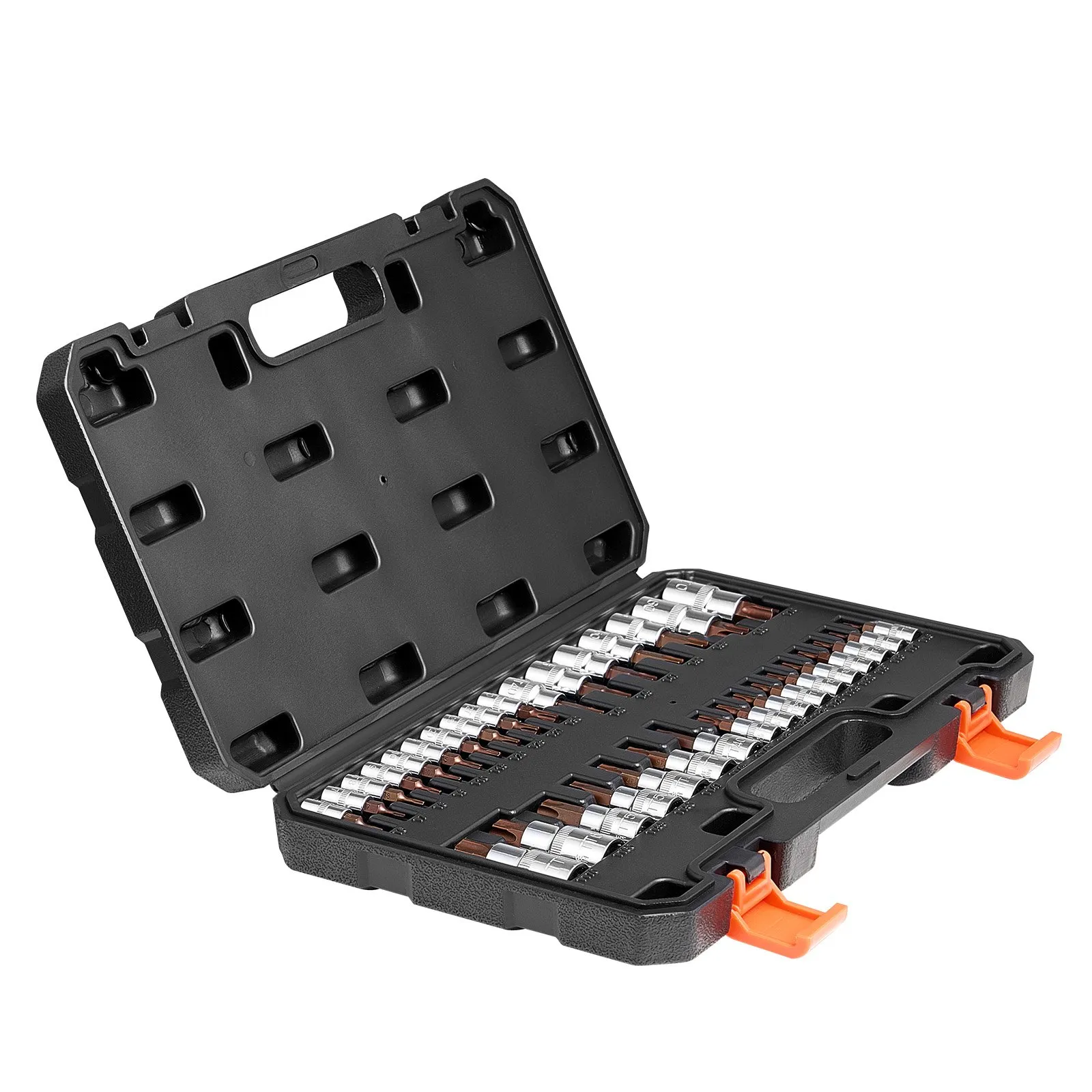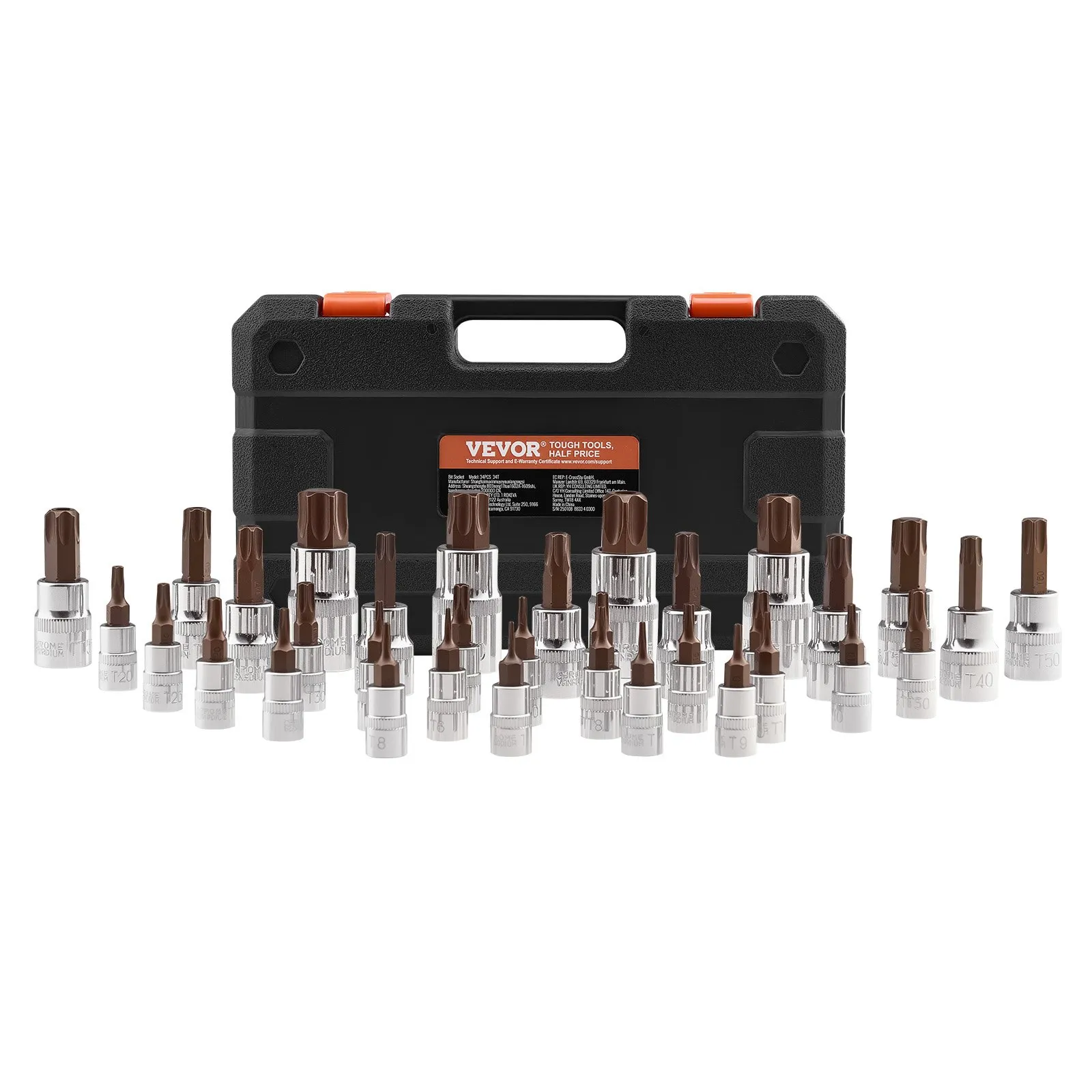 Sada objímok na vrtáky Torx, 34-dielna, plná hviezdicová a odolná voči neoprávnenej manipulácii, T6-T70, legovaná oceľ S2 a oceľ Cr-V, pohony 1/4″ a 3/8″ a 1/2″, s úložným puzdrom, na ručné použitie.