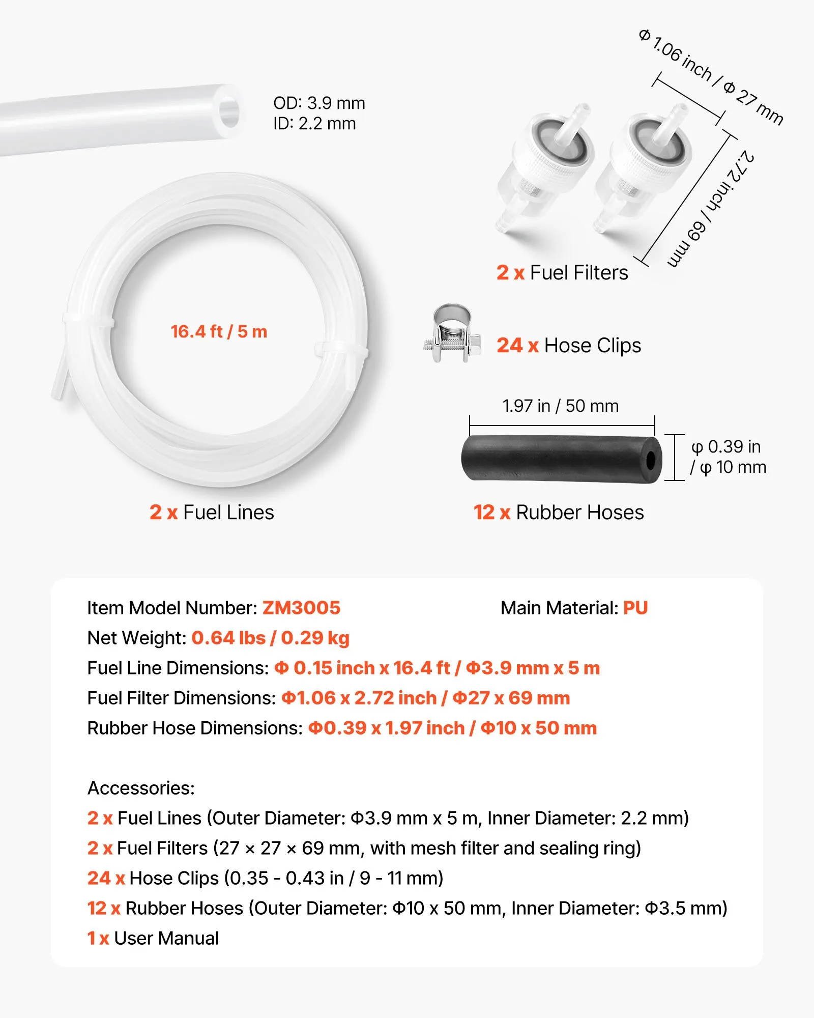Kompletný balík: Dostanete kompletnú opravnú sadu pre palivové potrubie vášho pomocného kúrenia vrátane dvoch palivových potrubí, dvoch filtrov, 24 svoriek a šiestich hadíc. Táto sada spĺňa vaše požiadavky na inštaláciu a údržbu väčšiny naftových ohrievačov vzduchu s výkonom 2 kW/5 kW/8 kW.