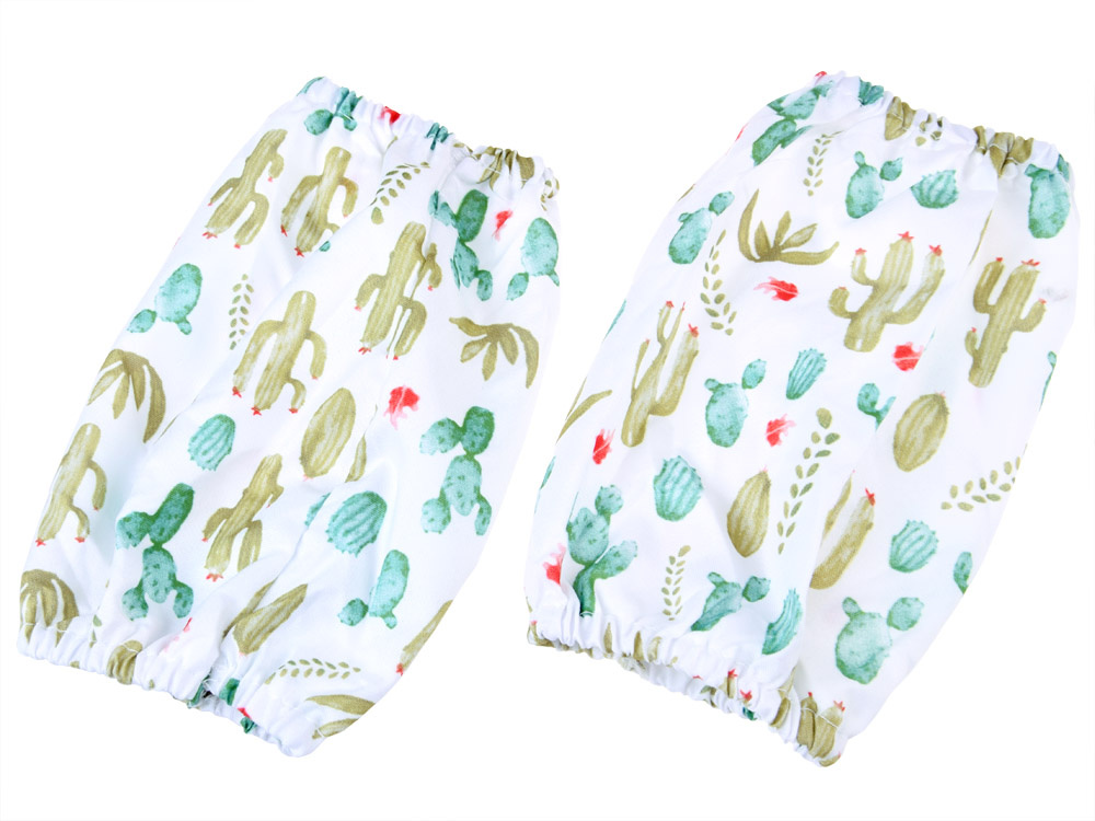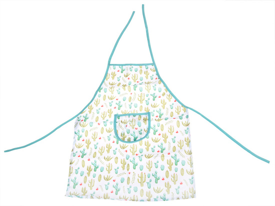 Látkové prvky – zástera, chrániče kolien, rukavice a taška – sú v bielej a zelenej farbe s motívom kaktusu a sukulentu .