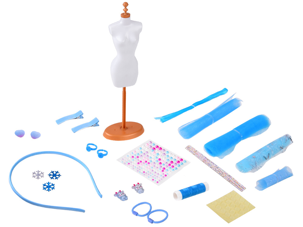 Pomocou ihly a nite si môžu pod dohľadom dospelej osoby vytvoriť sofistikovanejšie a krásne plesové šaty pre svoju bábiku. K dispozícii je množstvo dekoratívnych prvkov.