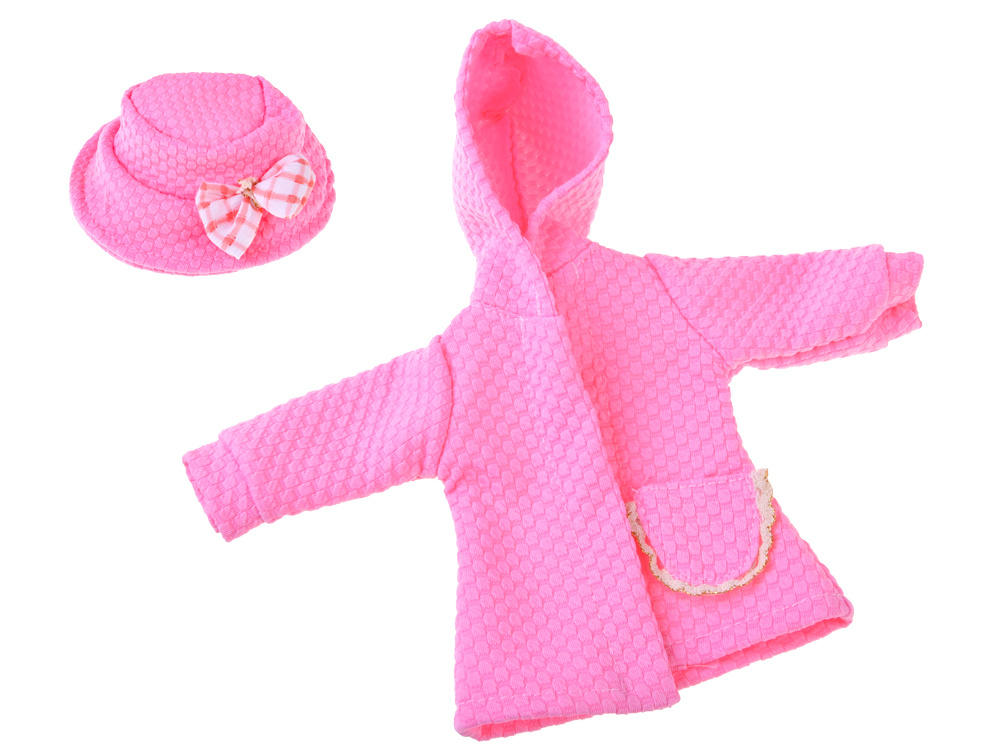 - Kabát – ružový, prešívaný kabát s dlhými rukávmi. Má pôvabné vrecko na prednej strane a kapucňu, ktorá bábiku chráni v chladnejších dňoch. Kabát sa nezapína, takže sa ľahko oblieka a vyzlieka počas hry. Tento detail dodáva celkovému vzhľadu eleganciu a vďaka nemu bábika vyzerá ako skutočná malá slečna.