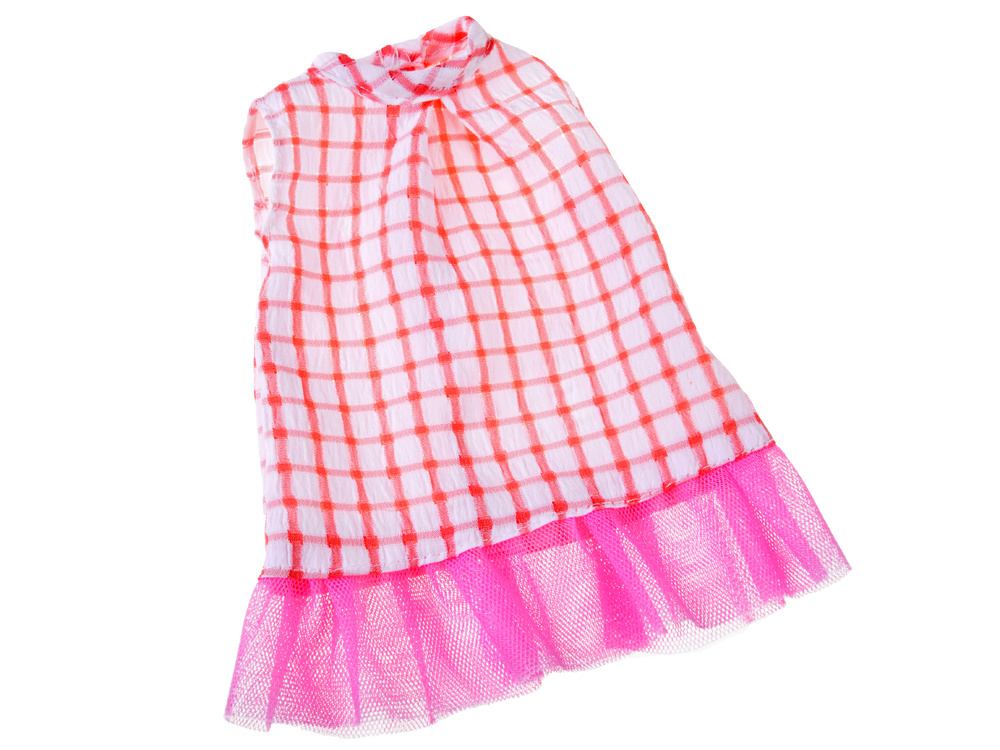 - Šaty sú pôvabné, biele s jemným ružovým kockovaným vzorom. Sú bez rukávov, čo im dodáva ľahký, dievčenský nádych. Lem zdobí volánik, ktorý ich robí ešte elegantnejšími. Šaty sa zapínajú vzadu na suchý zips, vďaka čomu sa ľahko obliekajú a vyzliekajú.