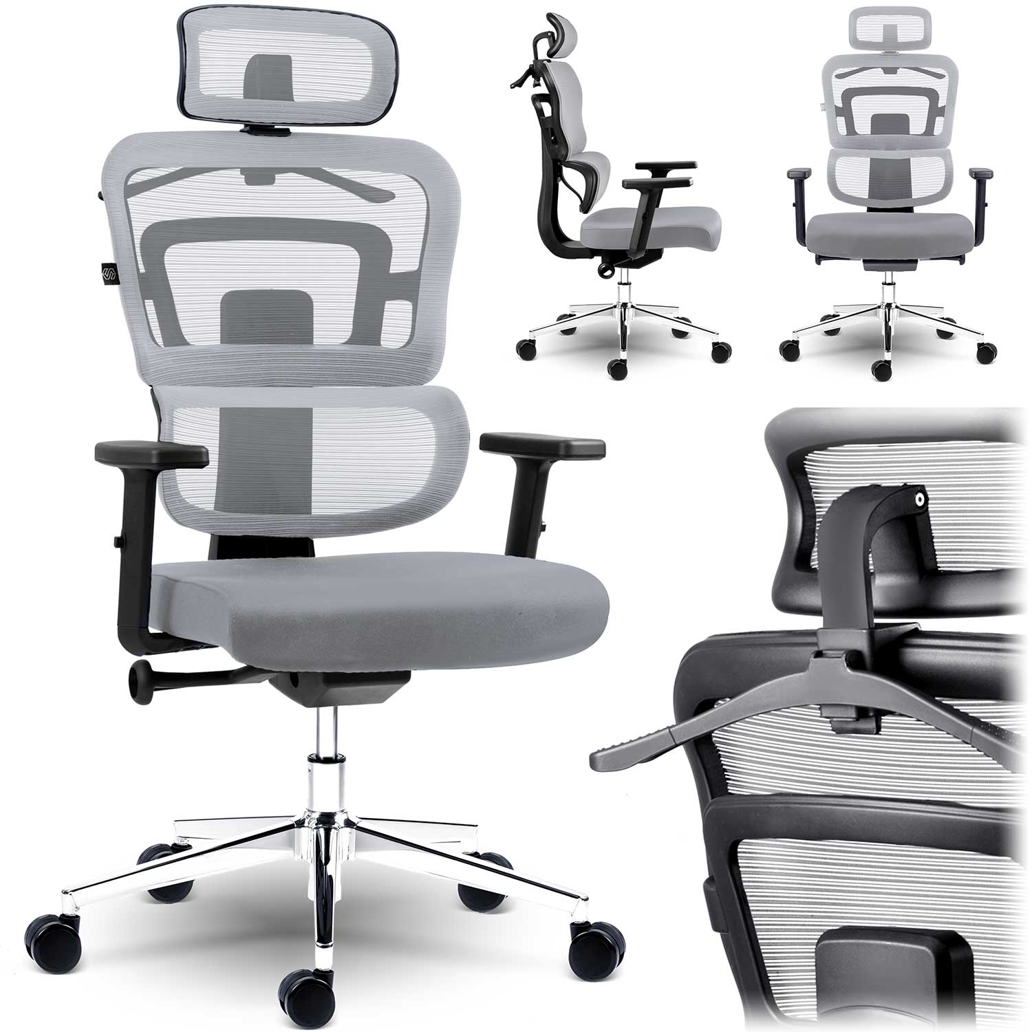 Päťramenná otočná chrómová základňa odolná voči poškriabaniu.
