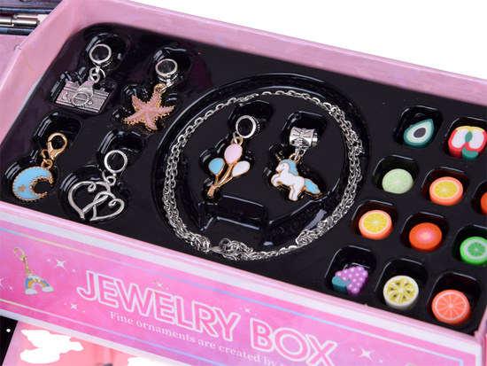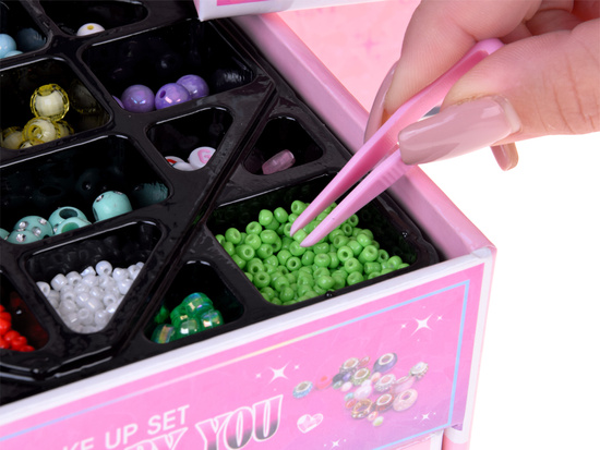 Prvá úroveň pozostáva z dvoch priehradiek, ktoré obsahujú náušnice, prstene a doplnky na ozdobenie kovového náramku a retiazky. Odsuňte bočné strany a vychutnajte si farebnú hostinu! Druhá úroveň obsahuje množstvo korálok v rôznych veľkostiach a farbách, ideálne na výrobu ručne vyrobených šperkov. Môžete použiť nápady z priloženej brožúrky alebo si vytvoriť vlastné jedinečné kúsky. Pod krabičkou na korálky nájdete cievku s elastickou šnúrkou na náramky a plastovú pinzetu na jednoduché navliekanie korálok. Vysuňte tretiu úroveň a odhalíte krásne vlasové doplnky, ktoré dokonale doplnia každý outfit. Okrem dvoch vlasových pásikov s očarujúcimi detailmi nájdete aj tri elegantné, predĺžené sponky do vlasov a rozmarné mašle vyrobené z tylu a čipky.