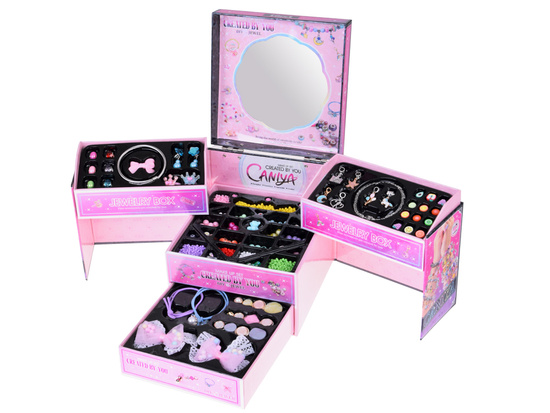 Táto rozšíriteľná šperkovnica plná korálok, príveskov, talier a vlasových doplnkov je splneným snom každého malého dievčatka! Vďaka nej sa bude cítiť ako dospelá žena. Dievčatá milujú sledovať, ako sa ich mamy chystajú, líčia, češú a upravujú im vlasy… a predovšetkým ich napodobňujú.