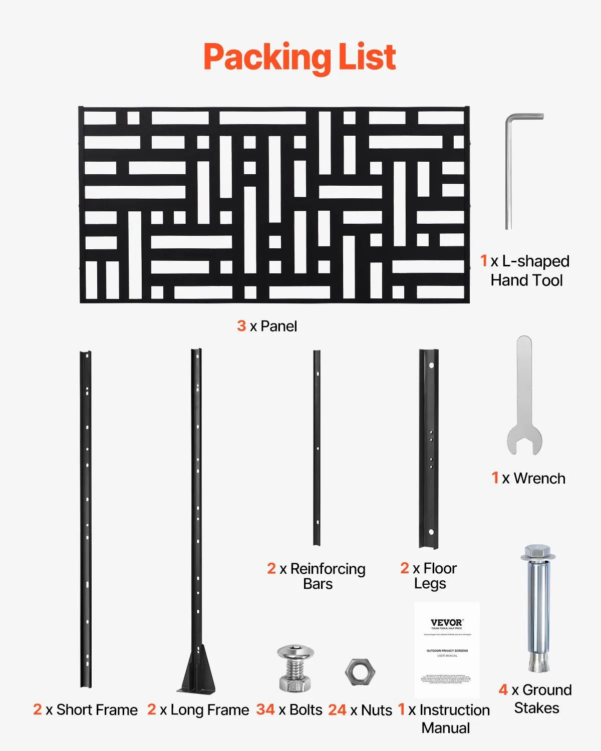 Obsah balenia: Balenie obsahuje 3 panely, 2 krátke rámy, 2 dlhé rámy, 2 nožičky, 2 výstužné tyče, 34 skrutiek, 24 matíc, 1 kľúč, 1 nástroj v tvare L, 4 zemné kolíky a 1 návod na obsluhu.