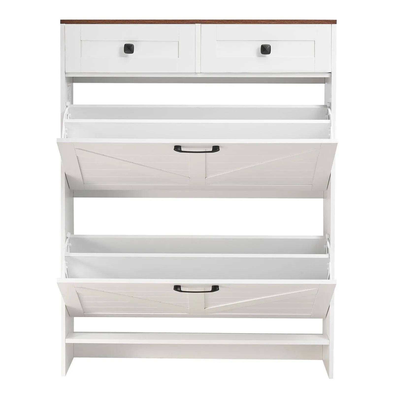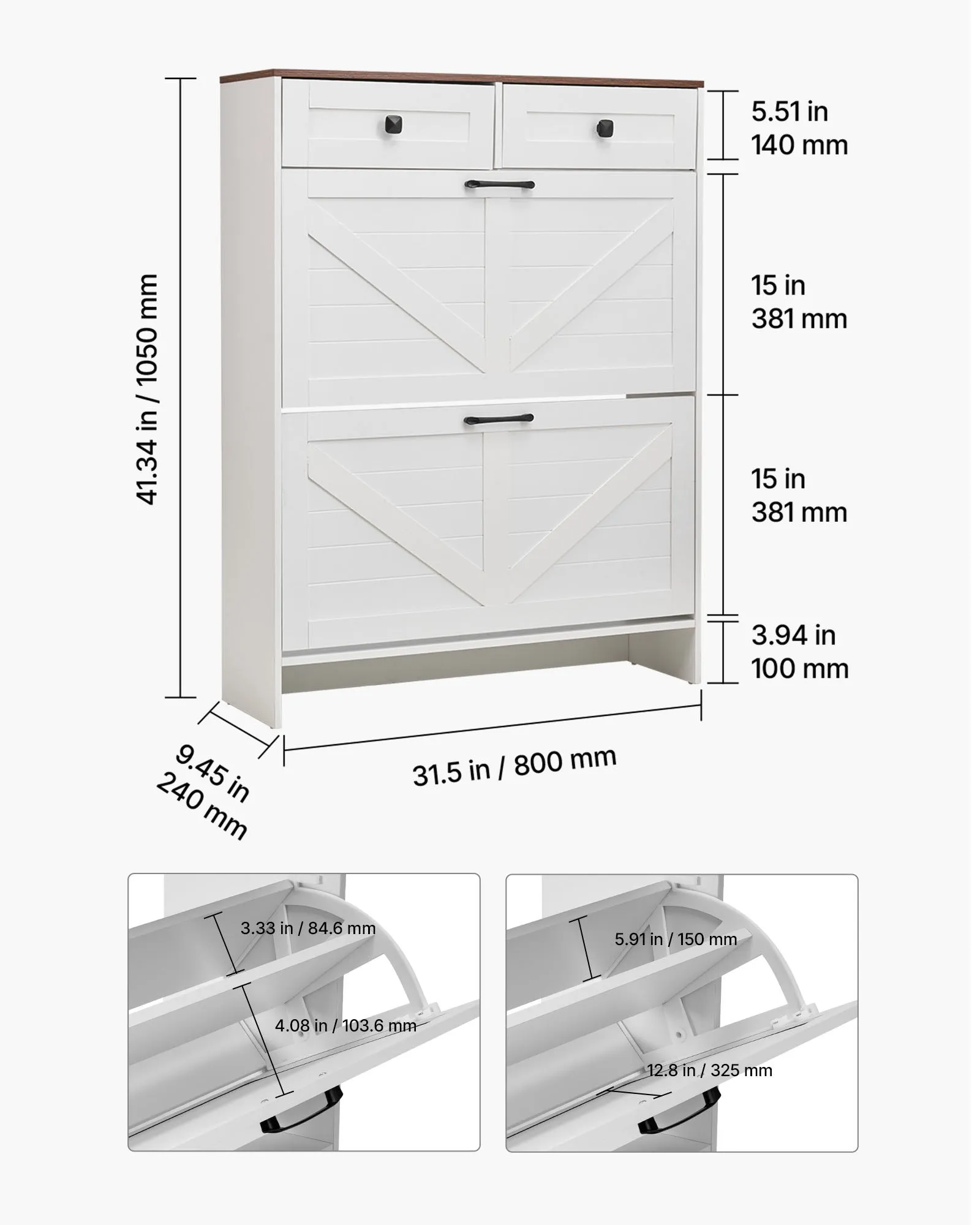 Veľká kapacita: Naša skrinka na topánky má dve výklopné zásuvky, každá s dvoma úrovňami. Horná úroveň je ideálna na dekorácie alebo vázy, zatiaľ čo spodná úroveň je ideálna na papuče. Dve výsuvné zásuvky poskytujú dodatočný úložný priestor na kľúče, peňaženky a iné drobnosti.